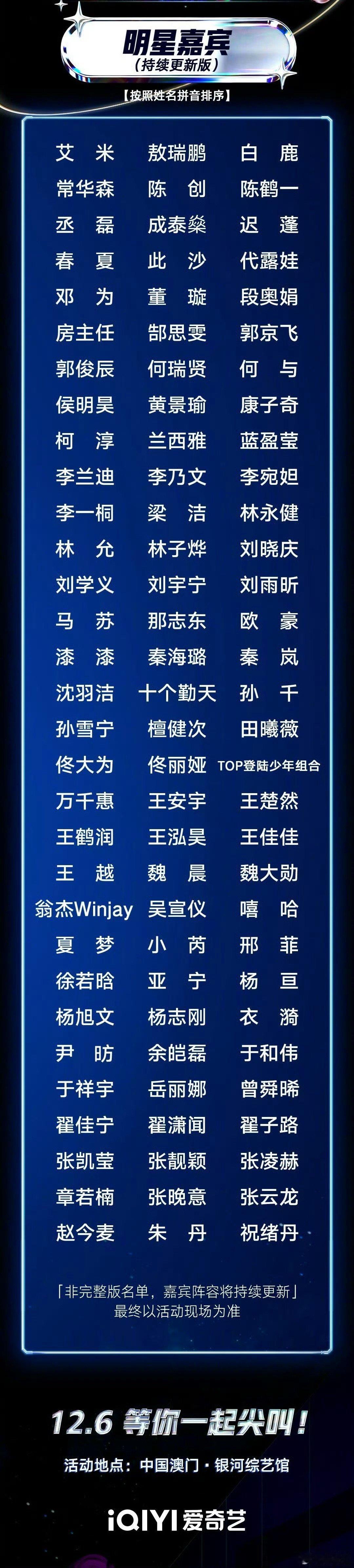 爱奇艺尖叫之夜首轮阵容官宣:艾米、敖瑞鹏、白鹿、常华森、陈鹤一、丞磊、此沙、代露娃、邓为、郭俊辰、何与、侯明昊、黄景瑜、李兰迪、李宛妲、李一桐、刘学义、刘宇宁、刘雨昕、檀健次、田曦薇、王楚然、王安宇、魏大勋、吴宣仪、徐若晗、张凌赫、曾舜晞、翟潇闻、章若楠、张晚意、张云龙、赵今麦 、祝绪丹,好多人啊啊啊啊