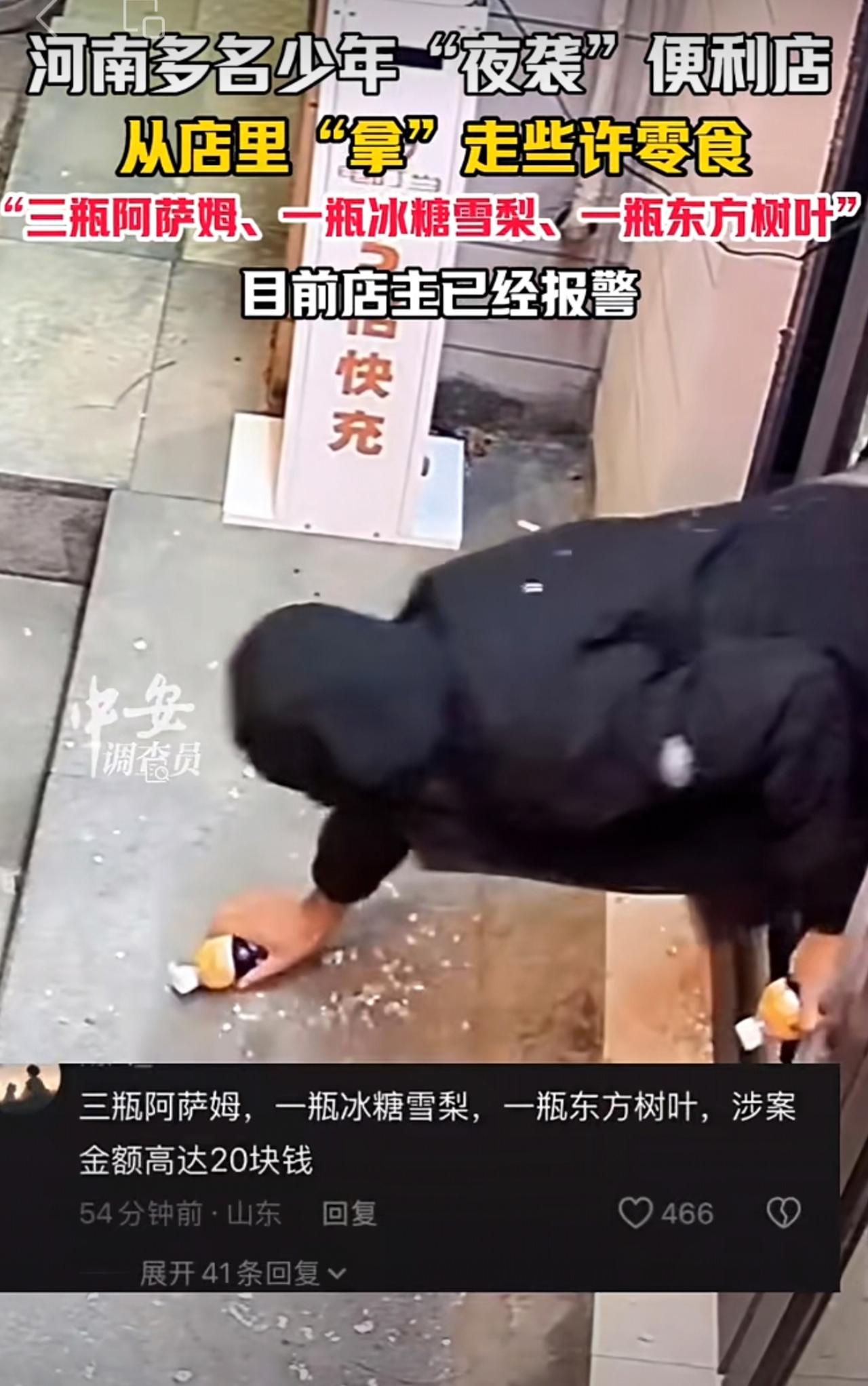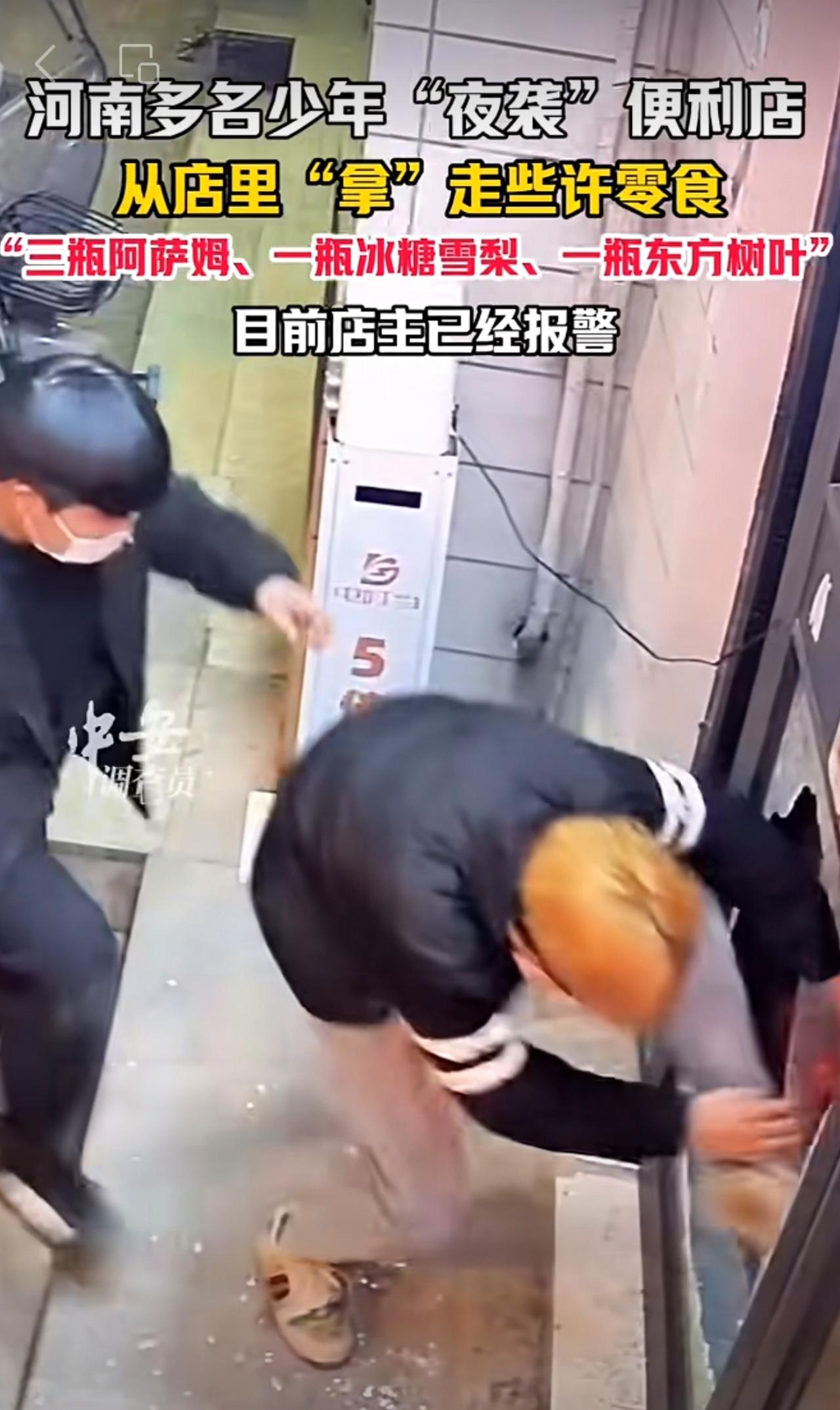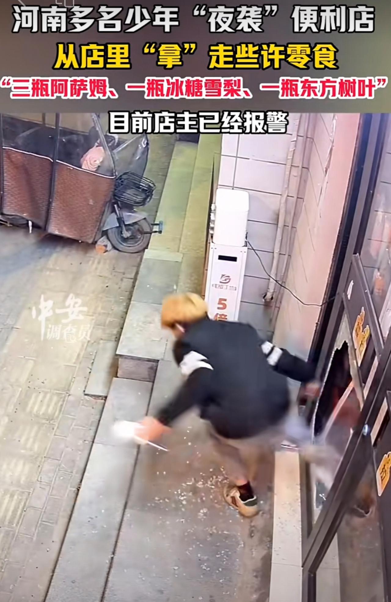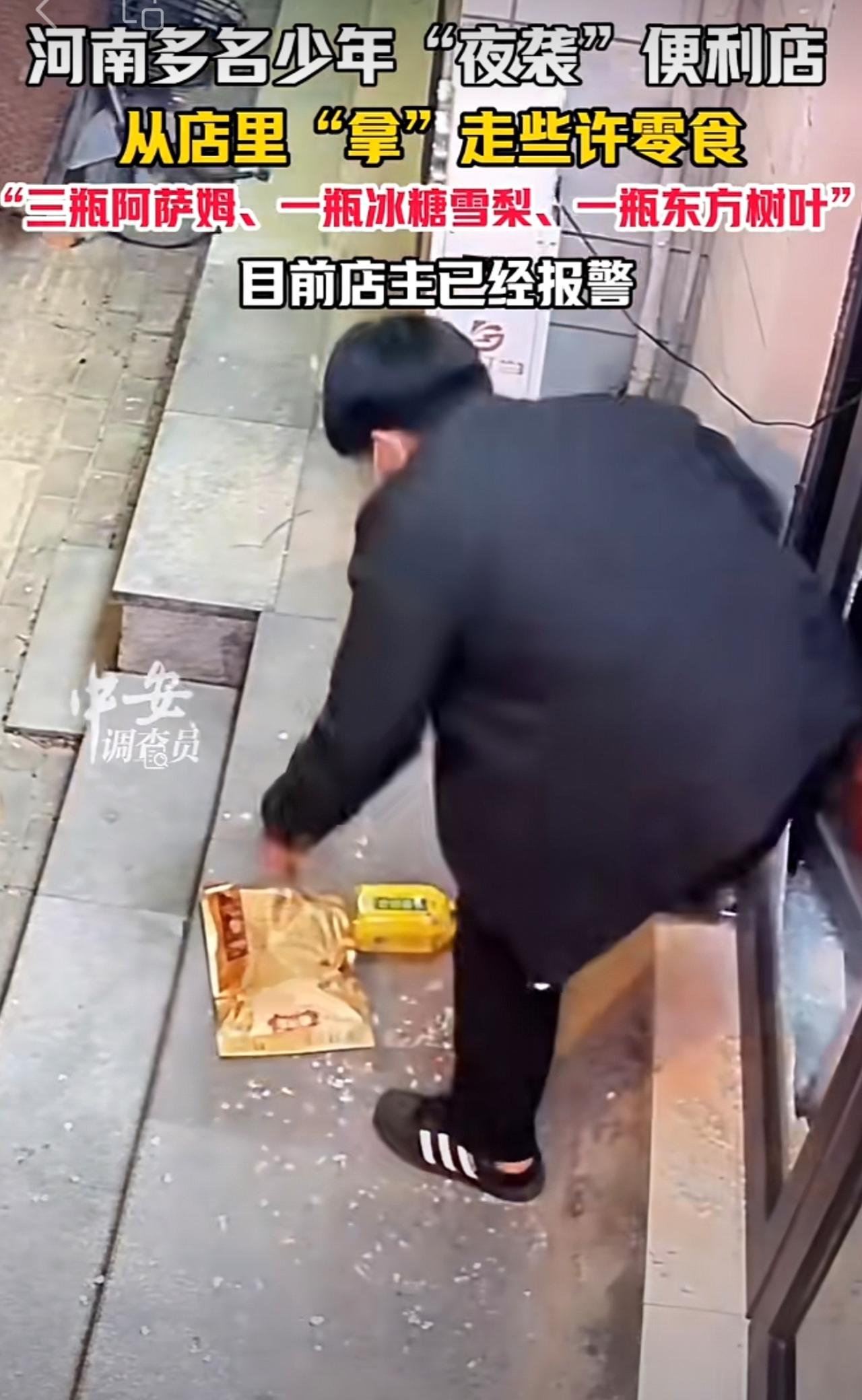 11月19日,河南开封。河南多名少年“夜袭”便利店,从店里“拿”走些许零食,“三瓶阿萨姆、一瓶冰糖雪梨、一瓶东方树叶”。目前店主已经报警。(编辑:昊昊)