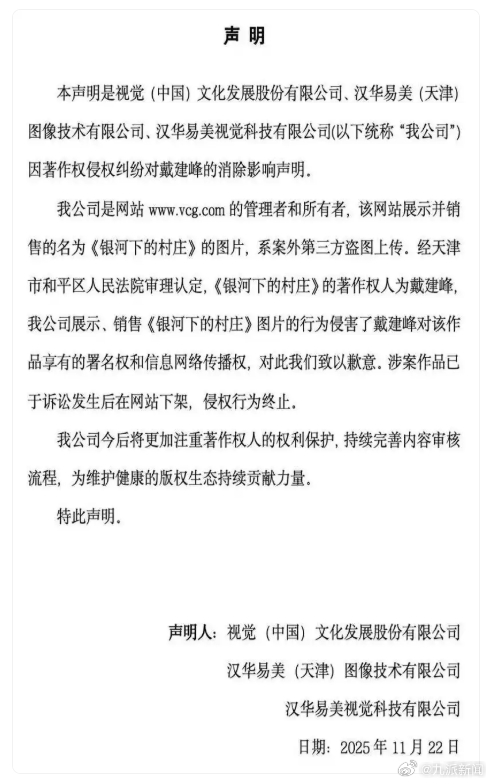 11月20日,摄影师戴建峰 发文称,其起诉视觉中国侵权一案已由天津市和平区人民法院作出一审判决。11月22日,视觉中国在官网首页发布判决中要求的声明:本声明是视觉(中国)文化发展股份有限公司、汉华易美(天津)图像技术有限公司、汉华易美视觉科技有限公司(以下统称“我公司”)因著作权侵权纠纷对戴建峰的消除影响声明。我公司是网站 www.vcg.com的管理者和所有者,该网站展示并销售的名为《银河下的村庄》的图片,系案外第三方盗图上传。经天津市和平区人民法院审理认定,《银河下的村庄》的著作权人为戴建峰,我公司展示、销售《银河下的村庄》图片的行为侵害了戴建峰对该作品享有的署名权和信息网络传播权,对此我们致以歉意。涉案作品已于诉讼发生后在网站下架,侵权行为终止。我公司今后将更加注重著作权人的权利保护,持续完善内容审核流程,为维护健康的版权生态持续贡献力量。特此声明。