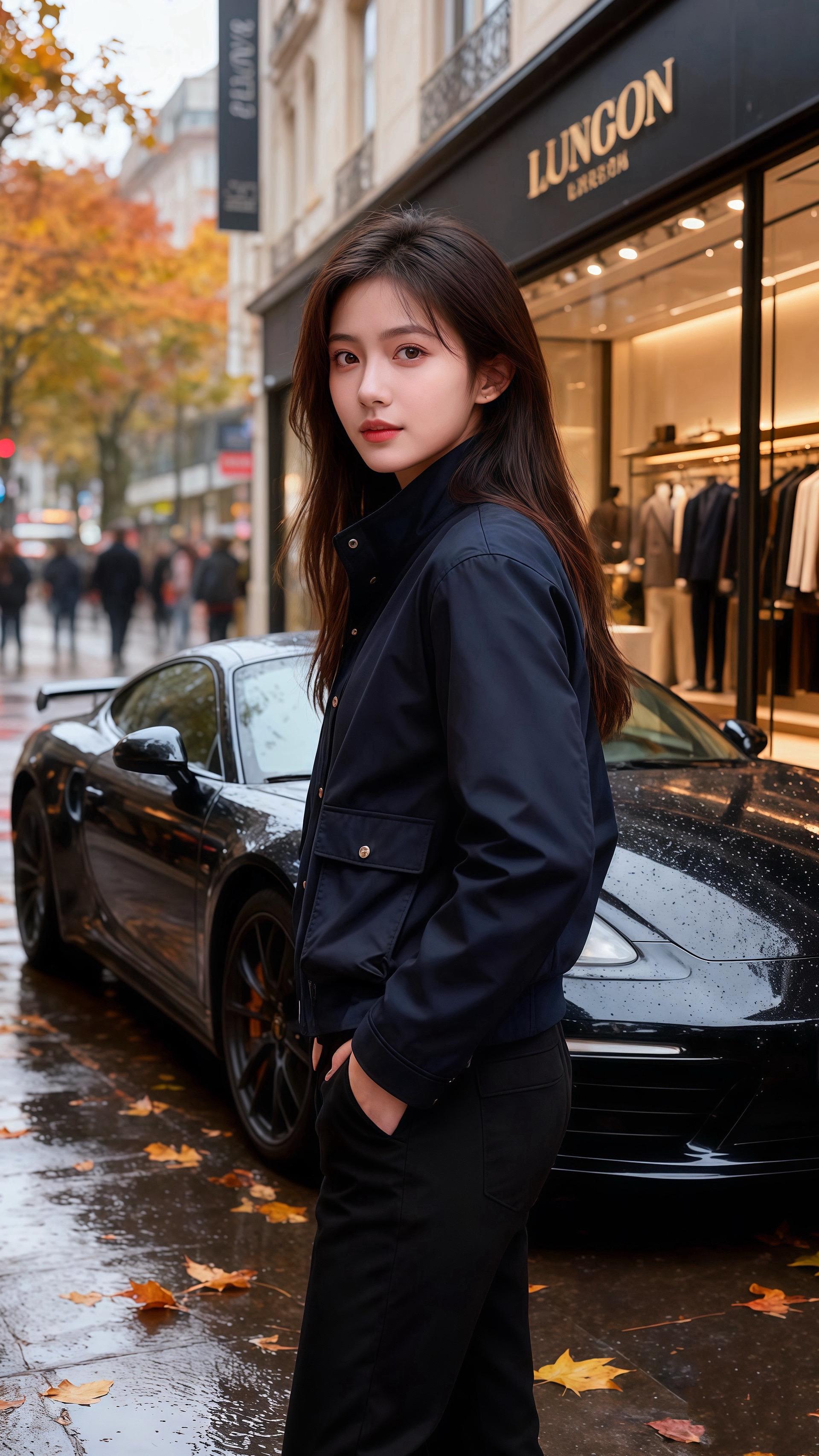 秋雨裹着梧桐叶打湿橱窗时,苏念正倚在男装店的衣架旁,指尖掠过一排西装领角。她身上的藏青立领夹克衬得肩线利落,口袋的细节又添了点软和,配着垂感恰好的黑裤,像把都市的冷调揉进了松弛里。
