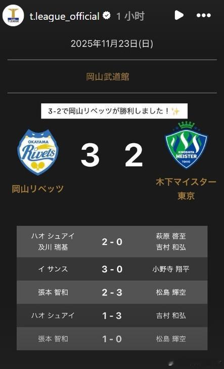 251123 冈山 3:2 木下郝帅/及川瑞基 2:0 萩原启至/吉村和弘 (5,10)李尚洙 3:0 小野寺翔平 (6,10,8)张本智和 2:3 松岛辉空 (-7,6,4,-5,-8)郝帅 1:3 吉村和弘 (-10,6,-2,-9)张本智和 1:0 松岛辉空 (11-8)