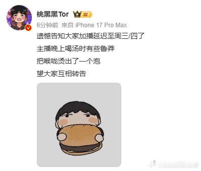 这个桃黑黑的请假理由又加一:主播晚上喝汤时有些鲁莽,把喉咙烫出了一个泡。这完全是请假理由参考大全哈哈!怎会如此!