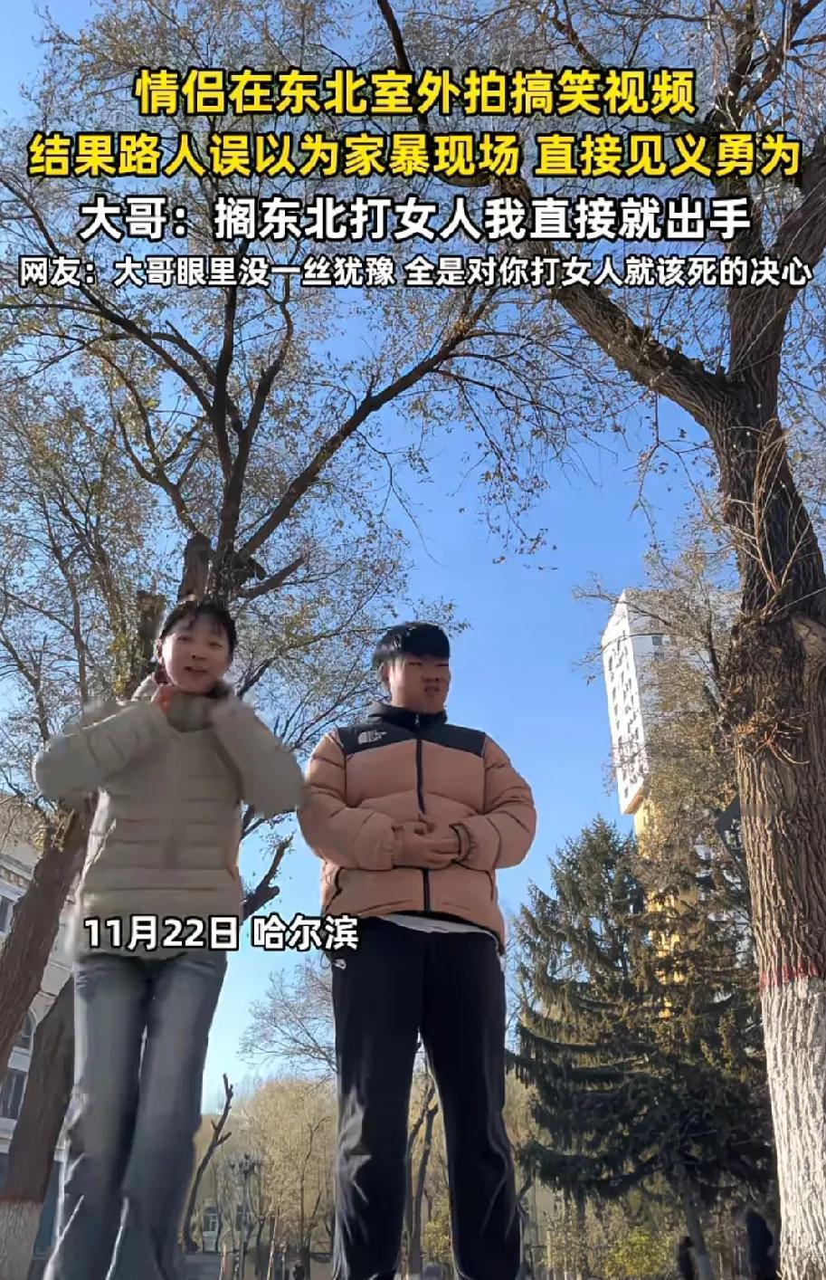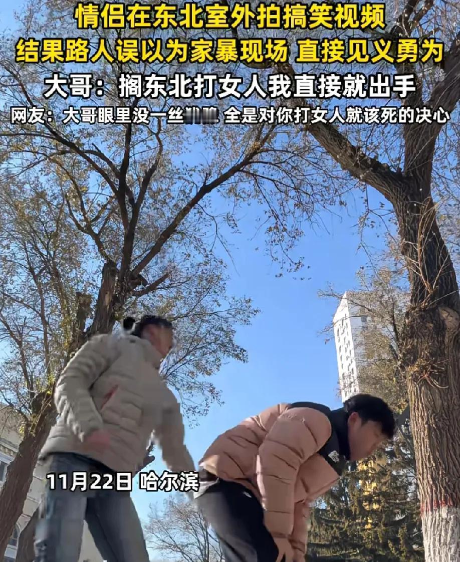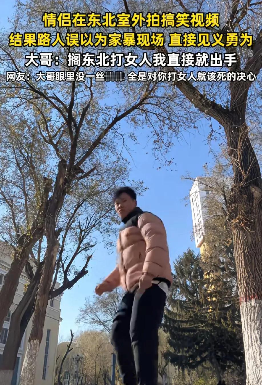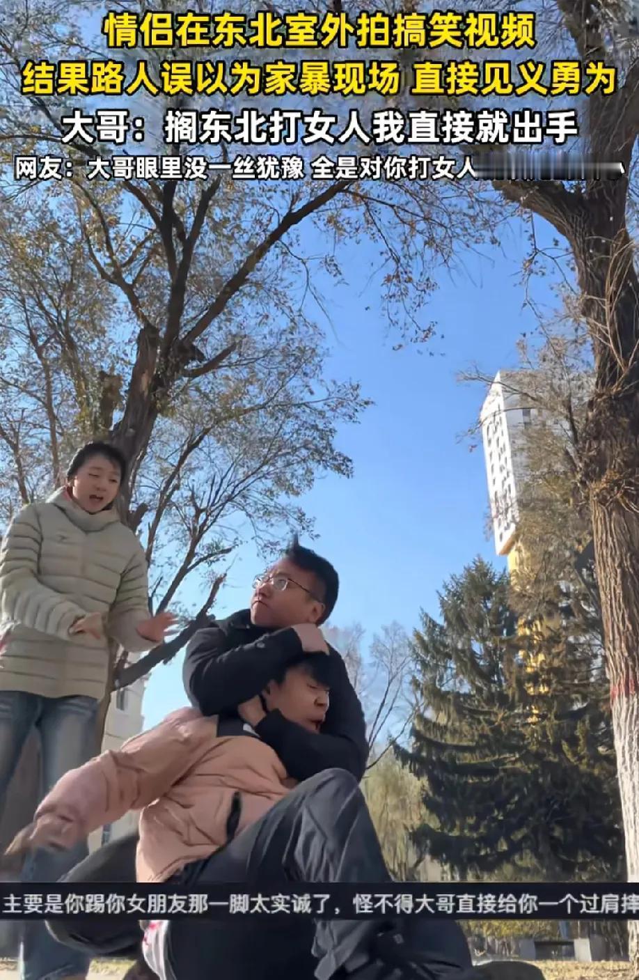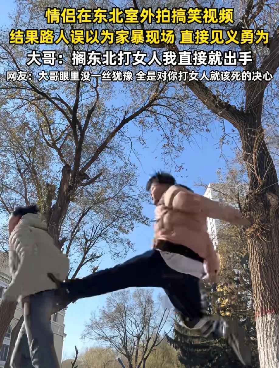 敢在东北打女人,你废了,这话具象化 一情侣在东北室外拍搞笑视频,结果路人误以为家暴现场,直接见义勇为。大哥,正义使者,先来个过肩摔,再来个抱头锁喉,直接制服“家暴男”,干脆利落! 关键,老婆轻轻的打屁股,老公起飞重重的踢,明显带有点个人情绪。难怪正义的大哥会误会,不说剧本,都以为是家暴! 家暴者当诛,地址东北+下狠手+表情太欠揍,纯属活该!