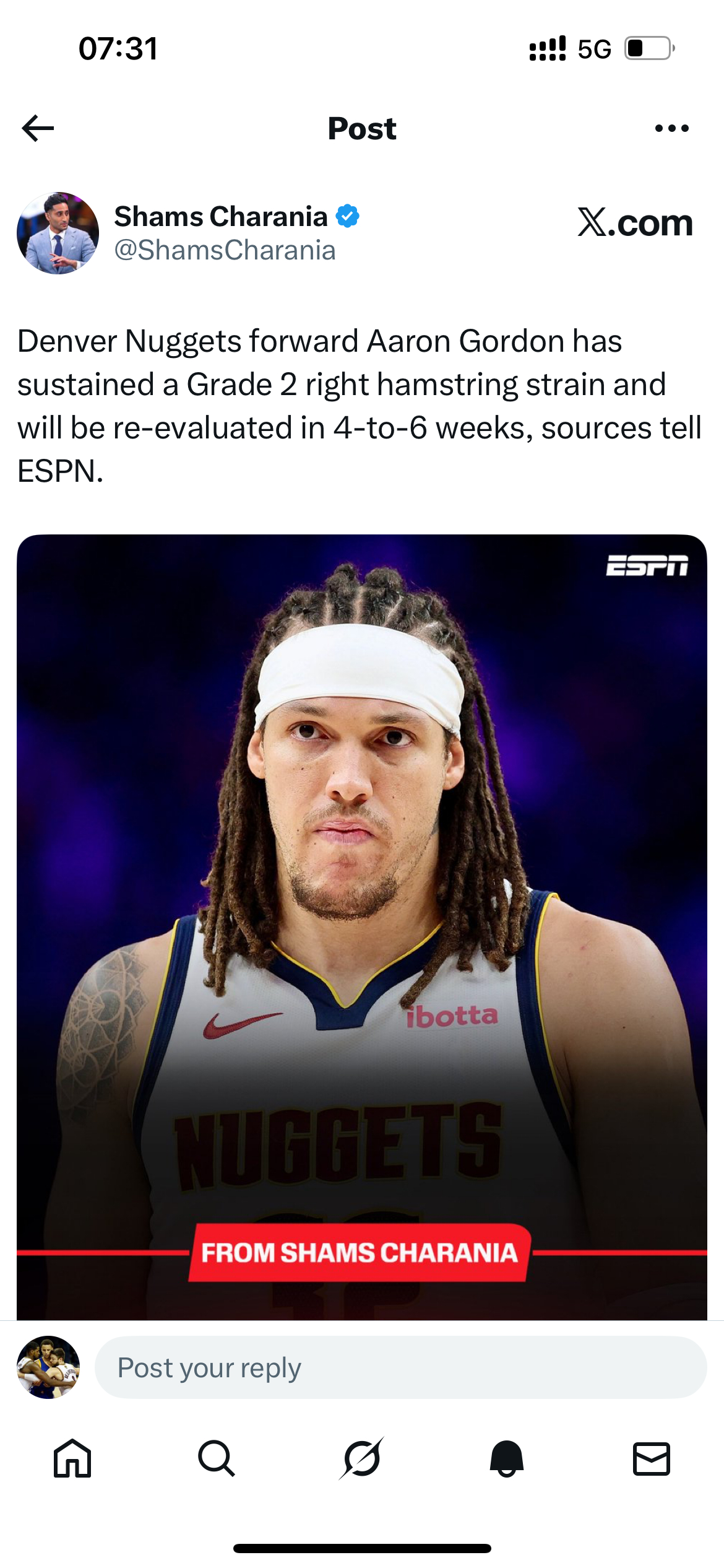 丹佛掘金前锋阿隆·戈登右腿筋二级拉伤,据ESPN消息人士透露,他将在四到六周后接受重新评估。