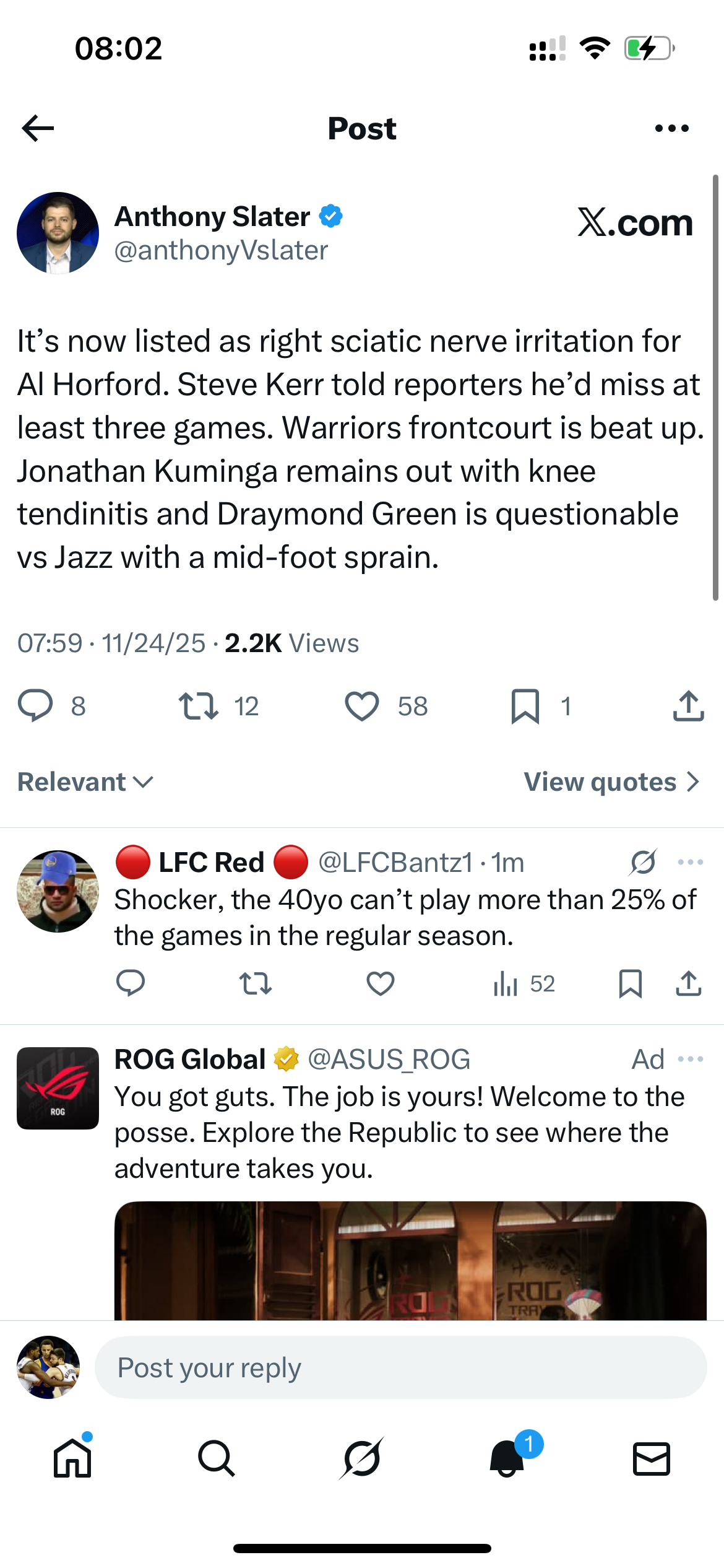 阿尔·霍福德的伤病现在被列为右坐骨神经刺激。史蒂夫·科尔告诉记者,他将至少缺席三场比赛。