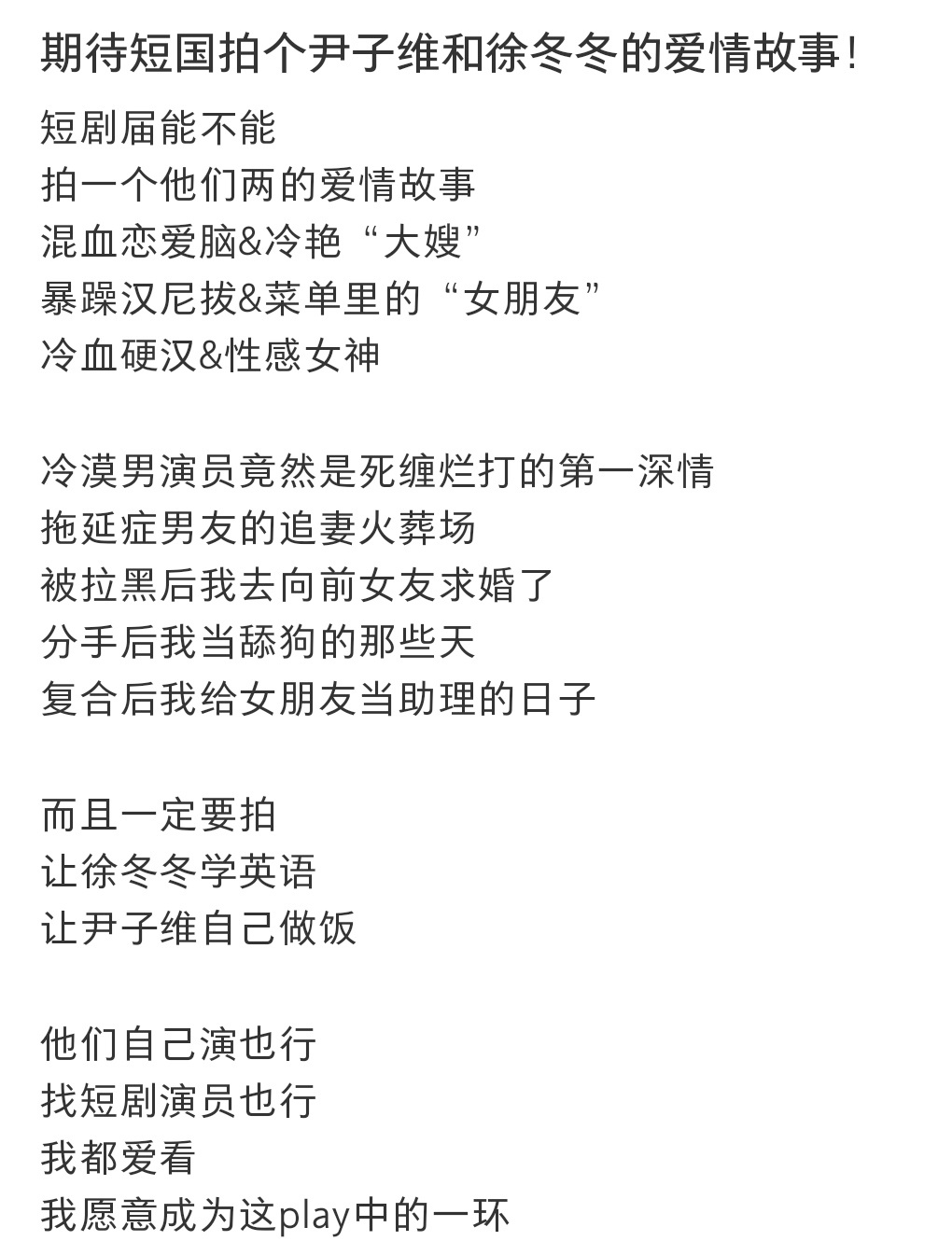 谁能拒绝大15岁的姐狗徐冬冬尹子维外表是不好惹的黑 道大哥,实则是粘徐冬冬的恋爱脑,秀恩爱被嫌还不收敛,短国赶紧拍他俩爱情故事,冷血硬汉vs性 感女神,这我真爱看