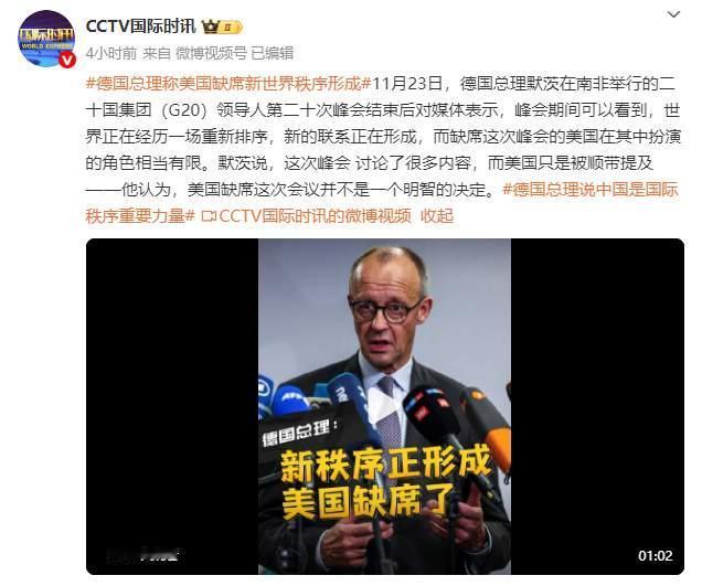 这一次的g二零会议开的好。 因为美国没有参会。放在正课啊,都放开了。 德国的总理说。美国缺席了。正形成世界的新秩序。 看来西方的这些政客啊,都放飞了。 已经放飞自我啦。 因为美国没有参会。他们想说什么都可以放开了说。 德国的总理莫茨在南非举行的20国集团会议领导人。 第20次峰会结束后表示。 就在峰会期间,他看到了世界正在经历一场重新排序。 新的联系正在形成。他还说。这次峰会讨论了很多内容。 而美国呢,只是被顺带的提及,他认为美国缺席这次会议啊,并不是一个明智的决定。 你这是啥意思啊?这是要叫板美国吗? 害怕美国打你的板子吗? 马克龙也讲话啦。还有加拿大的总理也讲话了。 看来西方那些政客都对美国不满了。