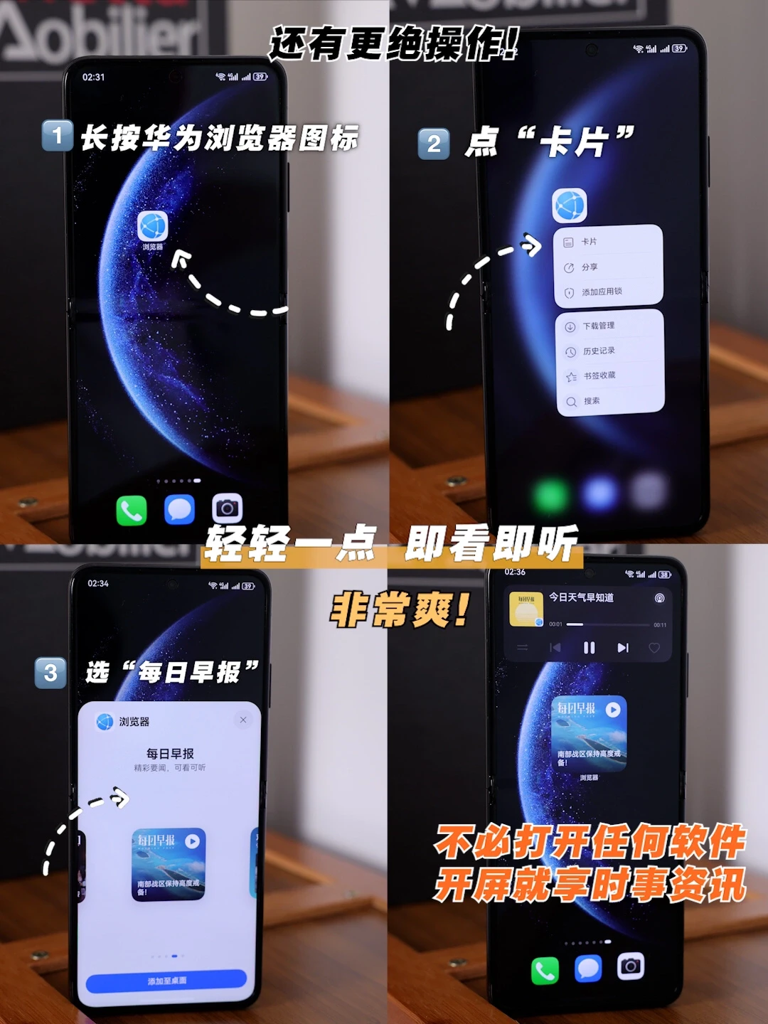 桌面长按浏览器图标,添加「每日早报」卡片。