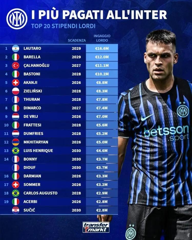 德国转会市场统计了国米球员的税前年薪,劳塔罗1660万欧居首,巴雷拉、恰尔汗奥卢二三位