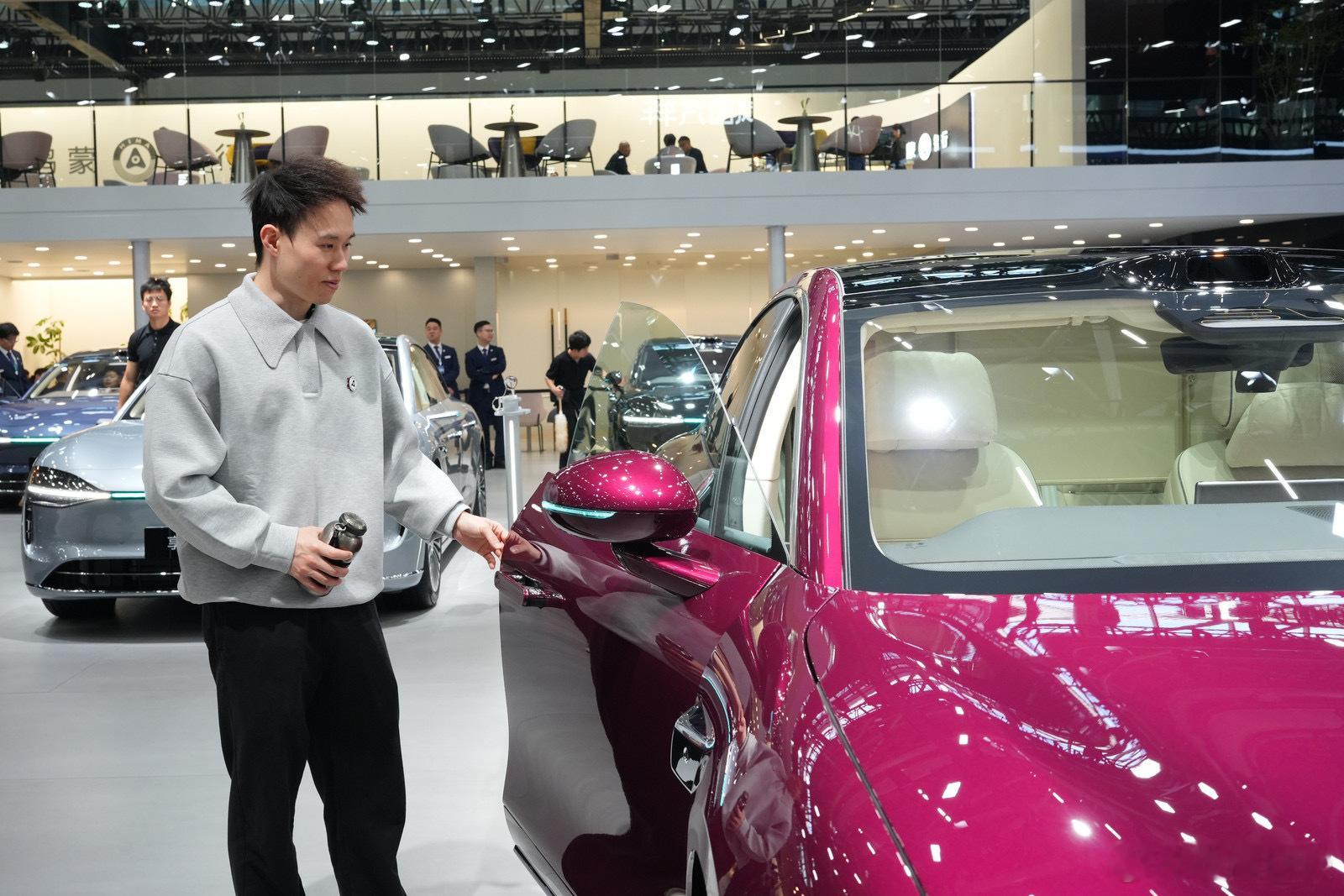 谢思埸逛车展也太接地气了!端着茶杯慢慢逛,遇到感兴趣的车就多停留一会,完全没有架子,这状态就像邻家大哥在帮家人看车。