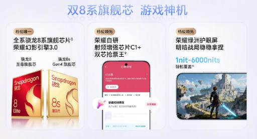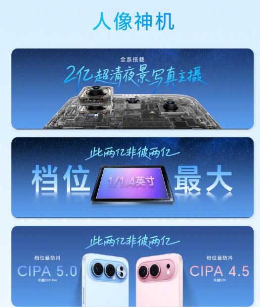 11月24号荣耀在杭州发了 500 系列新机,分超级标准版和 Pro 版,起售价 2699 和 3599 块,11 月 27 号全渠道开卖,首销买还送 999 块的尊享服务,挺划算的! 拍照方面超给力,全系都有 2 亿像素大底主摄,Pro 版还多了个 5000 万双防抖长焦,拍夜景、远照都稳。还有 Live 实况、破框而出这些玩法,发朋友圈超吸睛。性能也够用,分别装了骁龙 8s Gen4 和骁龙 8 至尊芯片,配着幻影引擎 3.0,玩《王者荣耀》《原神》能满帧跑,一点不卡。 续航是大亮点,8000mAh 青海湖电池超耐用,标准版能 80W 快充,Pro 版还能无线充,应急时还能给其他设备补电。另外手机是水晶小直屏,还有九大护眼功能,Pro 版通信也更强。顺带发的耳夹耳机 2 Pro,国补后才 466.65 元,性价比拉满!