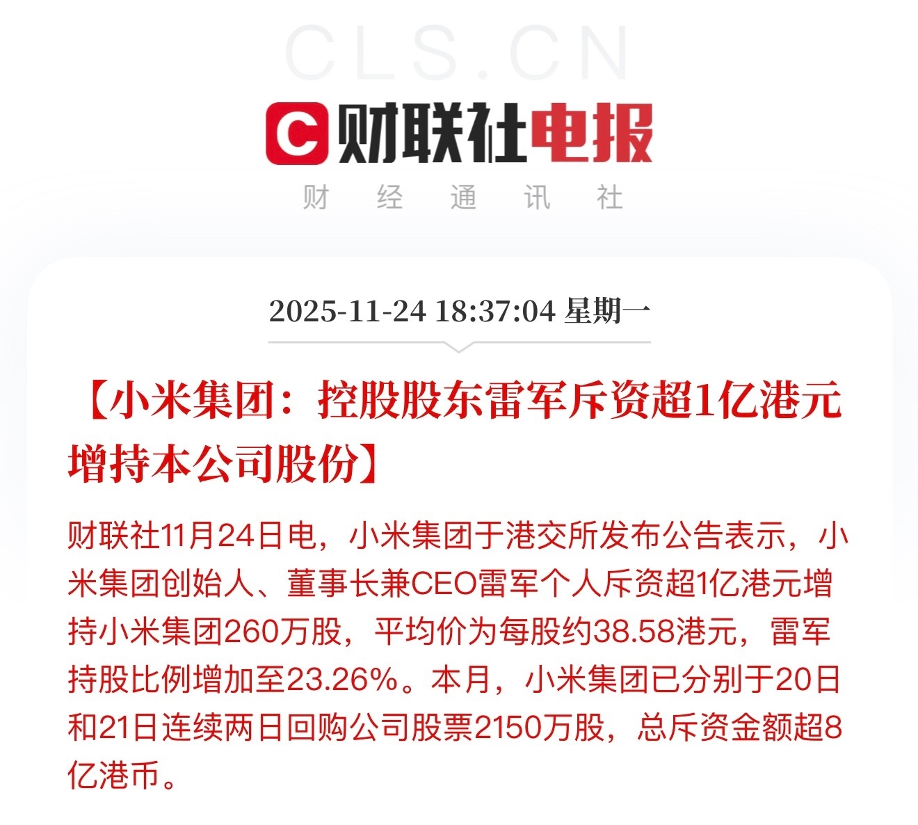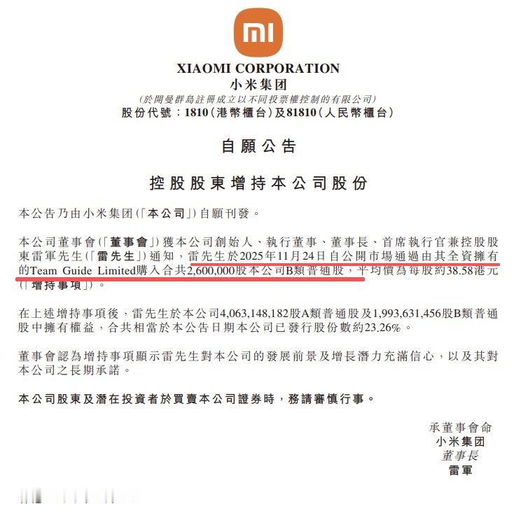 雷军个人斥资超1亿港元增持小米集团260万股,雷军持股比例增加至23.26%。