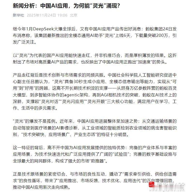 【新华社:中国AI应用正跑出“加速度”的势头】新华社刊发文章《中国AI应用,为何能“灵光”涌现?》。文章指出,继今年1月DeepSeek火爆全球后,又有中国AI应用产品传出好消息:蚂蚁集团24日发布消息称,该集团最新推出的全模态通用AI助手“灵光”上线6天,下载量突破200万,引发广泛关注。以“灵光”为代表的国产AI应用能快速走红,并非机缘巧合...