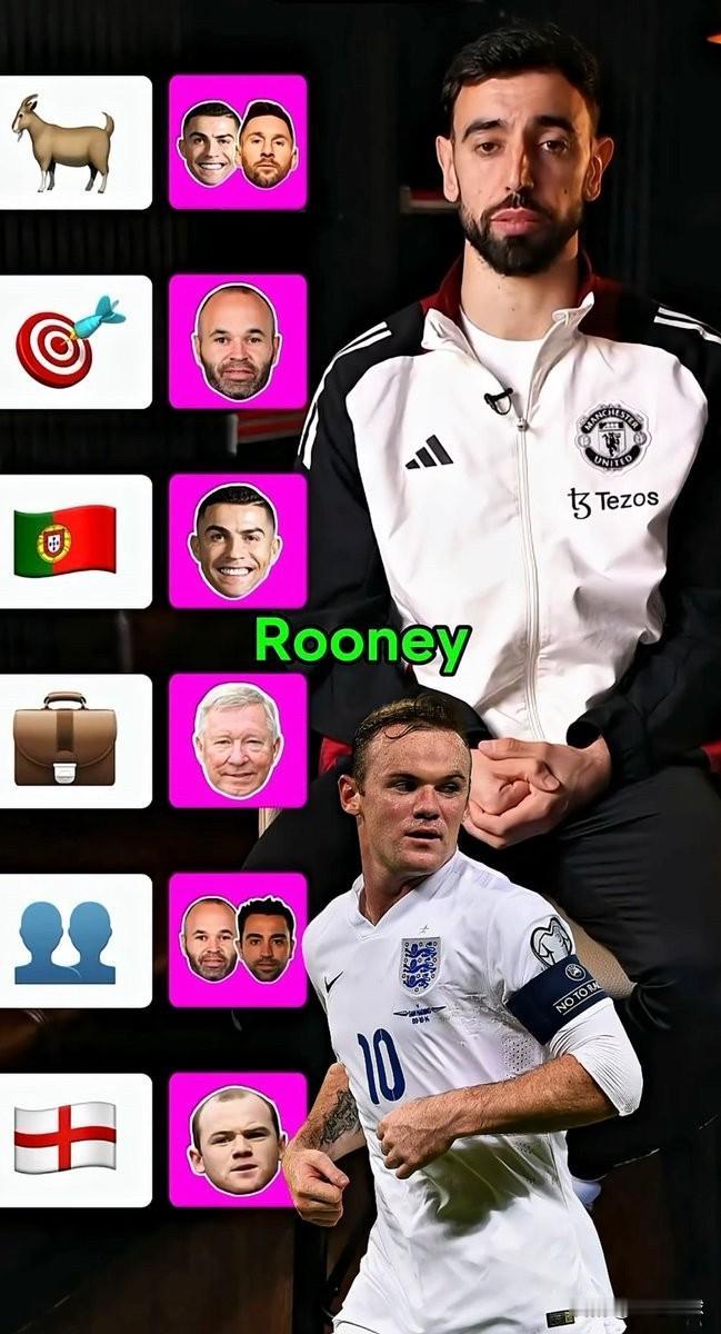 布鲁诺·费尔南德斯在问答环节给出以下答案: 历史最佳球员 —— C罗和梅西 最佳中场 —— 伊涅斯塔 最佳葡萄牙球员 —— C罗 最佳教练 —— 弗格森 最佳中场组合 —— 伊涅斯塔和哈维 最佳英格兰球员 —— 鲁尼 最佳主教练——弗格森