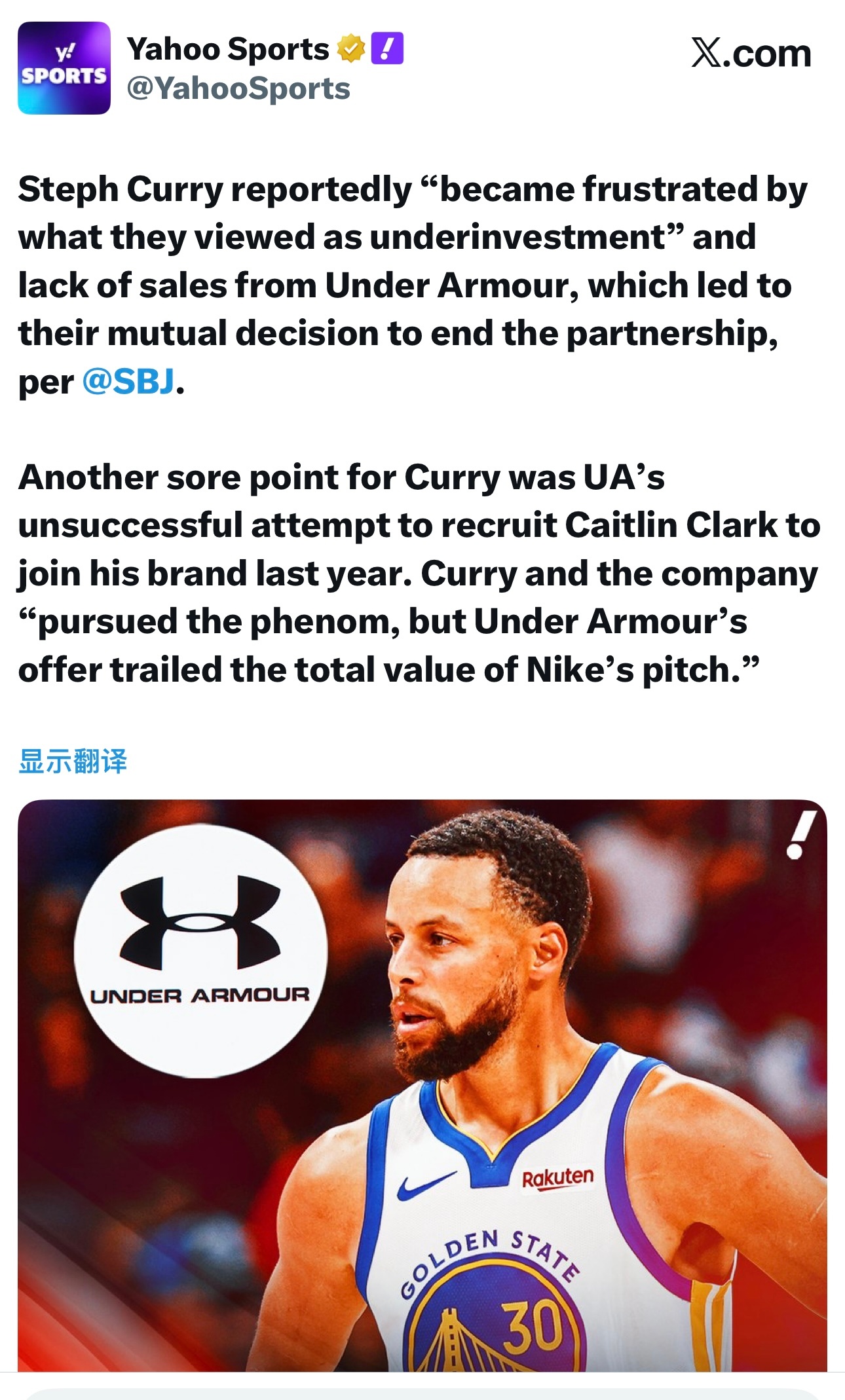 美媒SBJ:库里对安德玛未能签下WNBA球星凯特琳·克拉克感到失望,并且认为他们在他的品牌上投入得不够。库里曾亲自参与安德玛与克拉克的接洽,但最终克拉克选择与竞争对手耐克签约。此前,库里宣布与合作了13年的安德玛正式分道扬镳。据双方联合声明,这次分开是“经过深思熟虑且互相尊重”的决定。