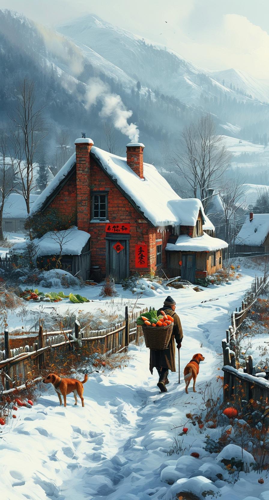 冬日生活打卡季一个冬日的乡村。红砖小屋静卧在雪白的世界中,屋顶和地面铺满了厚厚的积雪,袅袅炊烟升起,散发出温暖的气息。门上贴着喜庆的红色对联,增添节日的欢快氛围。雪地上,一条蜿蜒的小径引领着一位身穿厚重冬装、肩扛满载蔬菜的大篮子、拄着拐杖的行者缓步前行。两旁的木栅栏守护着他,身旁的两只棕色狗静静陪伴。远处雪山巍峨,白雪皑皑,无叶的树木展现出冬日的独特韵味。整体色调温馨而宁静,勾勒出一幅温暖祥和的冬日乡村画卷。田园风小屋 乡村冬日即景