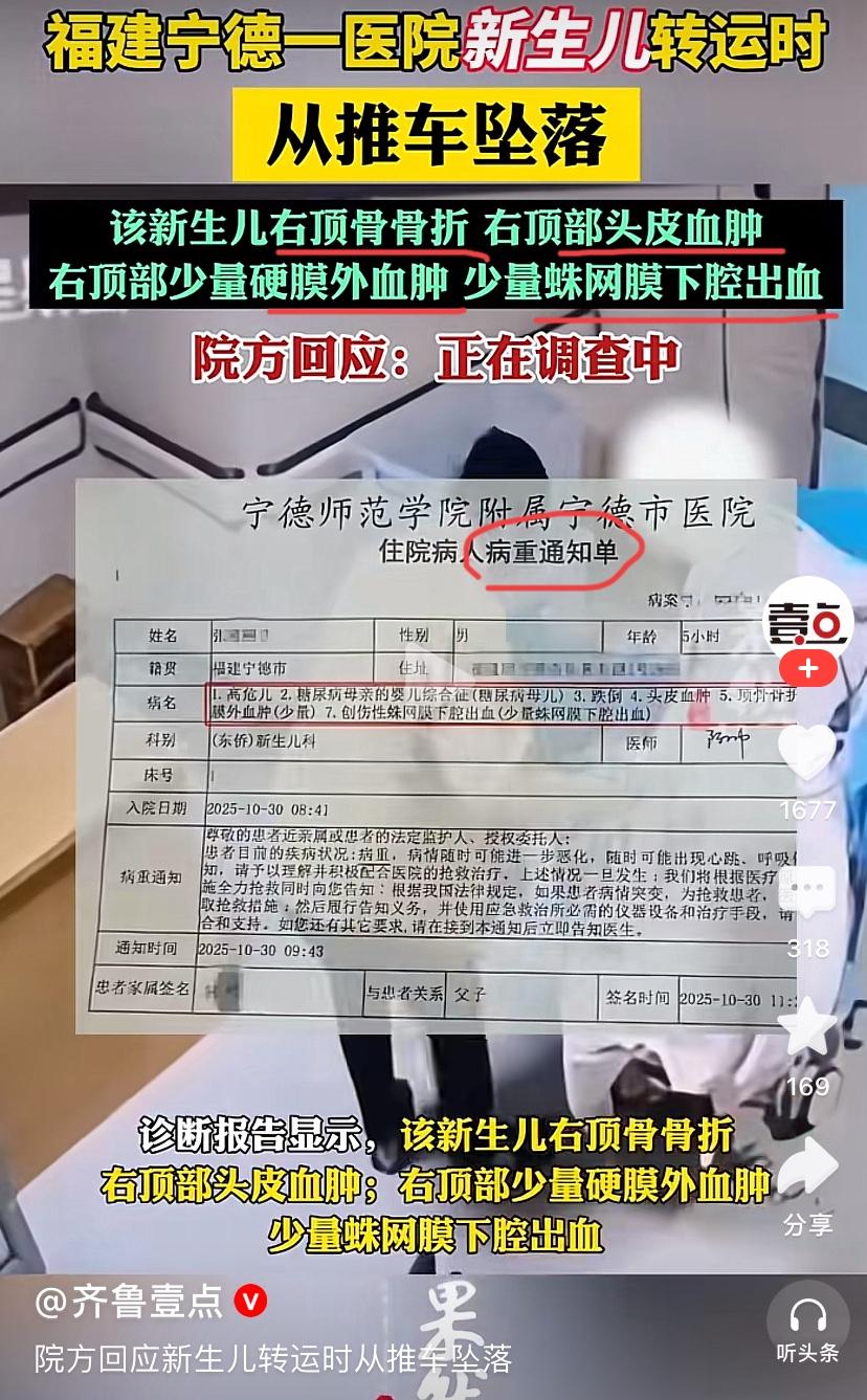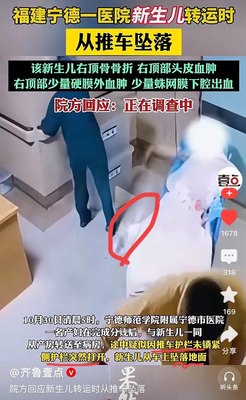 又一小生命意外事故让人揪心! 日前,坐标福建宁德某医院 产妇刚生完孩子 在转运回病房的途中 从视频看,应该还未出手术室区域 只见挨着婴儿那一侧的一名医护人员 转身似乎在登记着什么 我猜想很可能是登记医疗记录之类的 因为之前做过护士 在手术室中 每个环节都会登记好时间之类的 还得签上名字 而床尾一名医护人员好像 正在低头核实什么 谁能想到 就这一瞬间 挨着妈妈躺在手术床上的新生儿 突然从床上滚下来了 都说小孩子头软,不容易摔出问题 但很不幸的是 手术床有一定的高度 估计头部着地 新生儿脑部受到重创 诊断为右脑骨折 伴有血肿及少量脑出血 也不知道孩子现在脱离危险期没有? 太痛心了! 记得我生孩子时, 孩子也是就放在我身上 但因为都是平躺 孩子又不会动 一般我的一只手还会稍微护着孩子 孩子在身上是比较安全的 想必视频中孩子可能没放好位置 才会不小心掉落 总之,看着都很揪心!