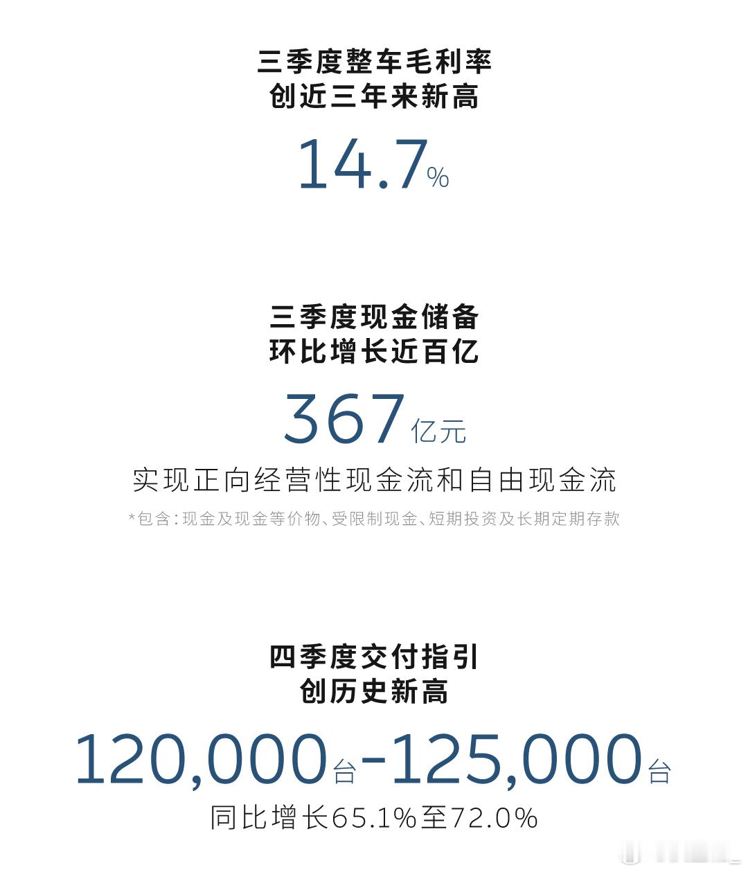 今天下午,蔚来发布2025年第3季财报三季度交付量:87071台同比增长40.8%、环比增长20.8%三季度营收:217.9亿同比增长16.7%、环比增长14.7%均为历史新高🍔三季度综合毛利率13.9%三季度整车毛利率14.7%三季度现金储备367亿元实现正向经营性现金流、自由现金流🍔预计四季度交付在120,000——125,000台蔚来、乐道、萤火虫齐齐发力,越来越好啦