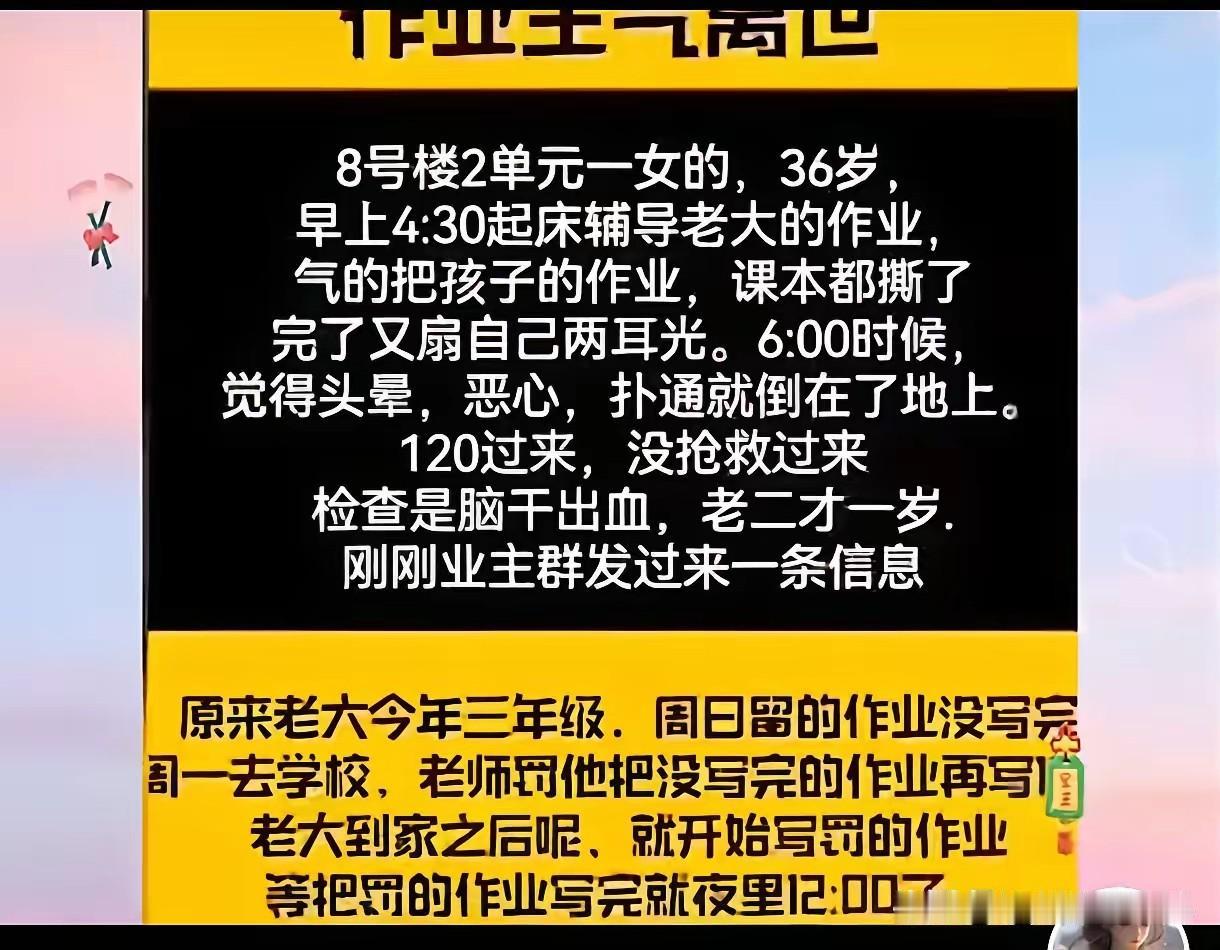 一家长因辅导孩子作业情绪崩溃,引发脑干出血,最终抢救无效死亡。此类悲剧并非个例:杭州80后父亲为备战中考的孩子辅导作业,因争执诱发急性心肌梗死;合肥宝妈改作业时情绪失控后同样脑干出血离世。 背后是教育内卷的裹挟,家长被迫将家庭变成第二课堂,承担本不该由家庭主导的学业辅导压力,焦虑与怒火最终酿成无法挽回的后果。 这不是家长脾气差的个体悲剧,而是教育生态错位的血淋淋控诉。 学校把专业的学业辅导责任甩给家长,用“家校共育”的名义变相转嫁压力,让家长沦为编外教师,家长则把自身未实现的人生期待、社会唯分数论的焦虑,全部压在孩子作业本上,将辅导变成“情绪宣泄场”。 所谓为孩子好,不过是用爱包装的情感绑架,家长用生命为内卷买单,孩子在斥责中丧失学习兴趣,而整个教育体系却在“分数至上”的惯性里漠视人的存在,当教育沦为竞争机器,家长和孩子都成了被吞噬的牺牲品,这样的成长,早已背离了教育育人的本质。