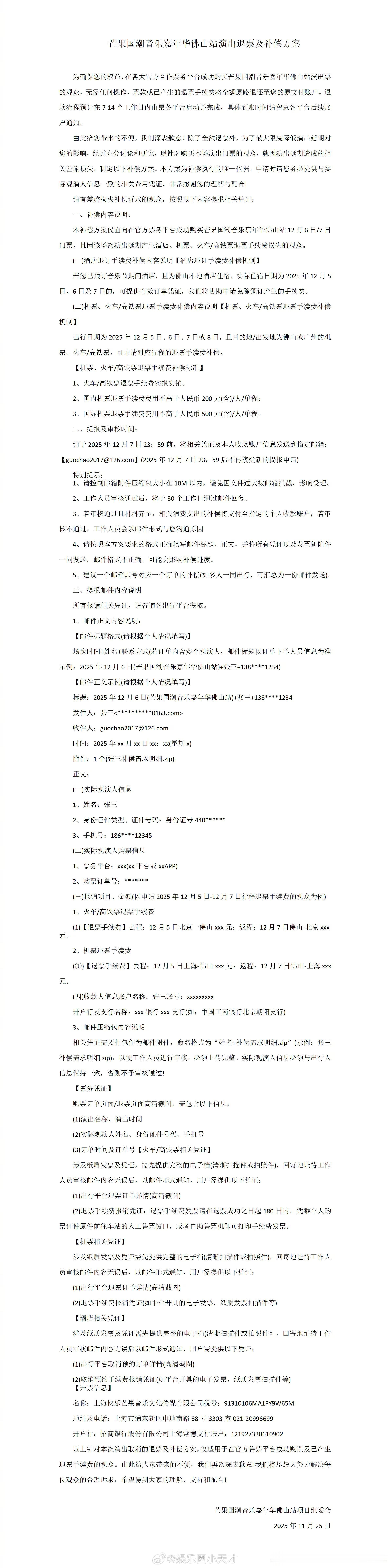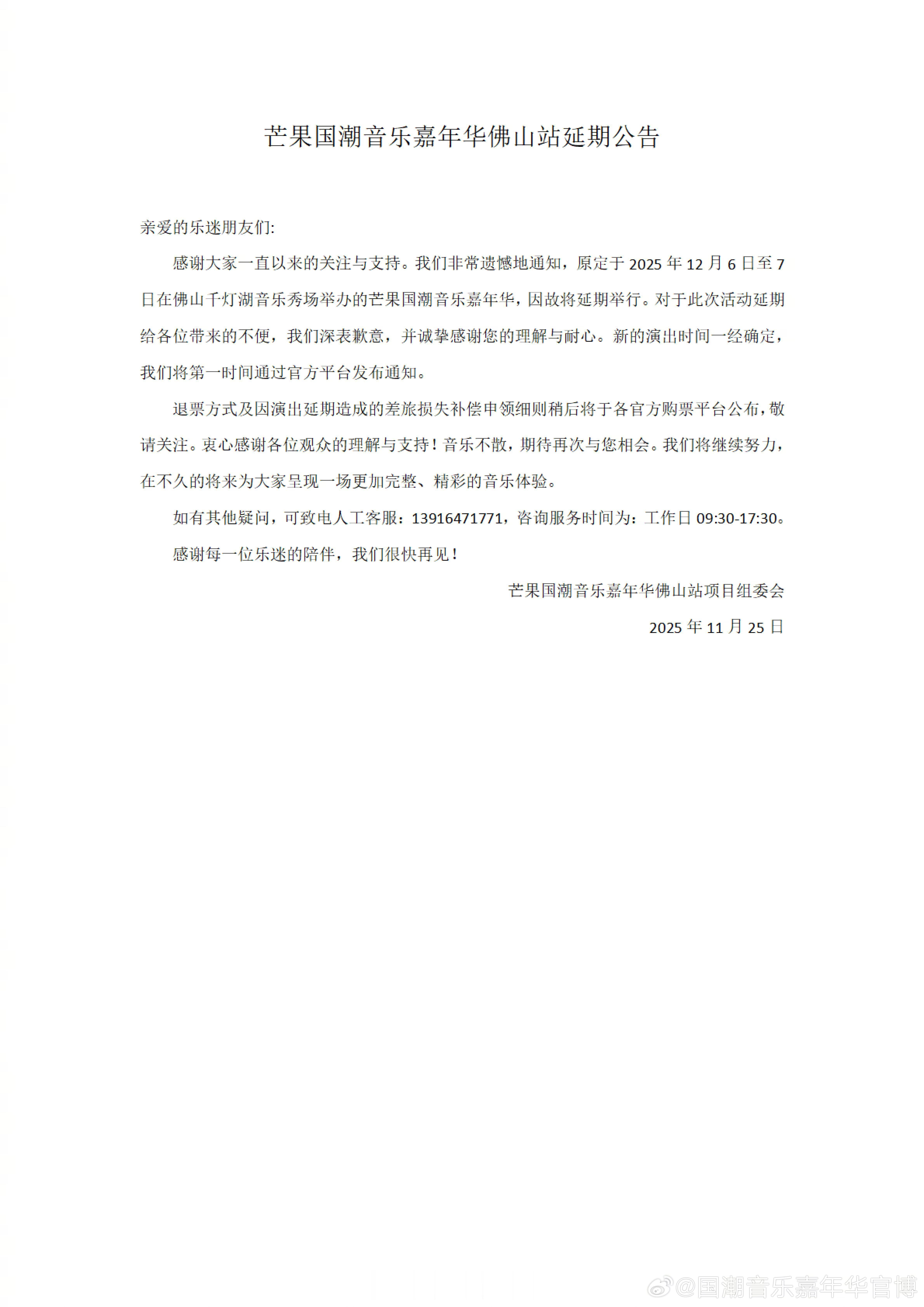 原定于12月6号和7号举办的国潮音乐嘉年华佛山站取消延期了,主办方还发了补偿方案
