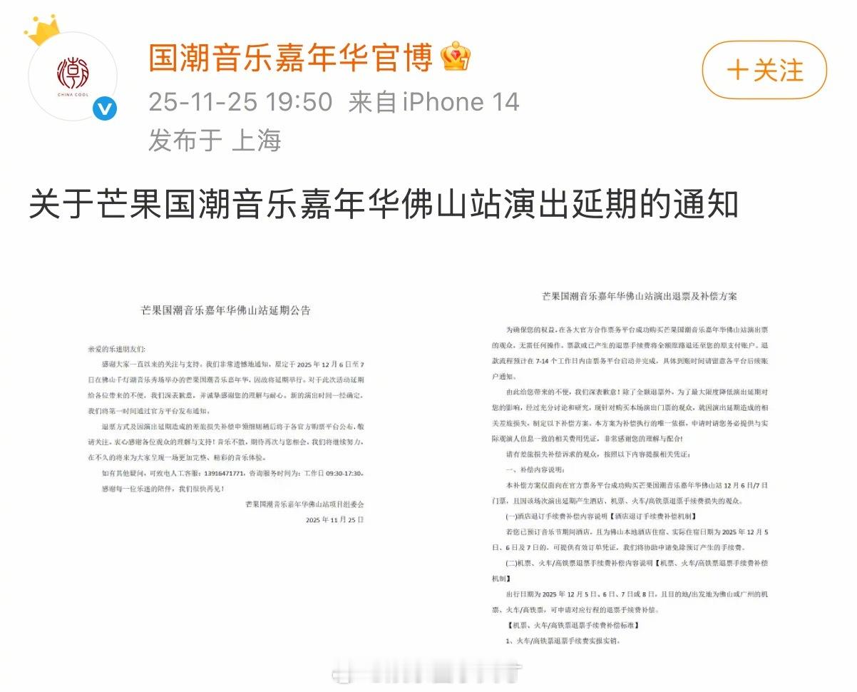 原定于12月6号和7号举办的国潮音乐嘉年华佛山站取消延期了,主办方还发了补偿方案。