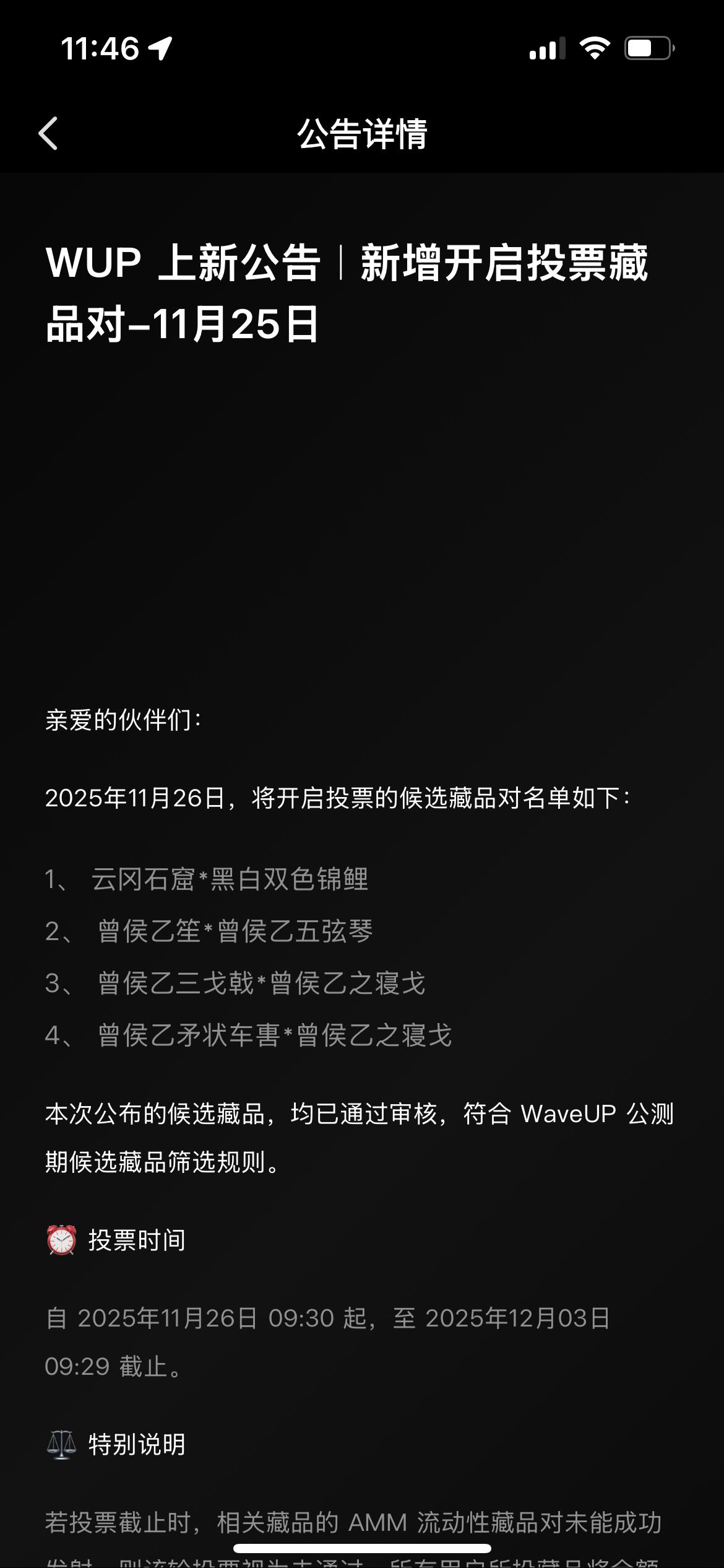 WaveUp投票新局:曾侯乙热度领跑,云冈石窟蓄势待发。 近日,WaveUp平台新增四对投票藏品,为市场注入了新的活力。从初步的参与度表现来看,新旧藏品呈现出显著差异,其中“曾侯乙”系列表现尤为抢眼。 数据显示,曾侯乙系列藏品的用户参与热情极为高涨,其中一组参与度更是达到了惊人的81.8%,展现出强大的社区共识和市场号召力。这一强劲表现,无疑巩固了其在平台内的核心地位,也反映出用户对这类具备深厚文化底蕴IP的高度认可。 相比之下,新晋加入的“云冈石窟黑白鱼对”则处于市场探索的初期阶段,目前参与度仅为1%。作为新面孔,其价值认知与社区共识尚需时间积累与培育。这一数据既是挑战,也预示着未来广阔的成长空间。 此次投票活动清晰地勾勒出市场热点与潜力股的分野。曾侯乙的卓越表现为平台树立了标杆,而云冈石窟等新藏品则需在社区运营与价值传播上持续发力,以期迎头赶上。鲸探 曾侯乙尊盘 青铜器巅峰之作