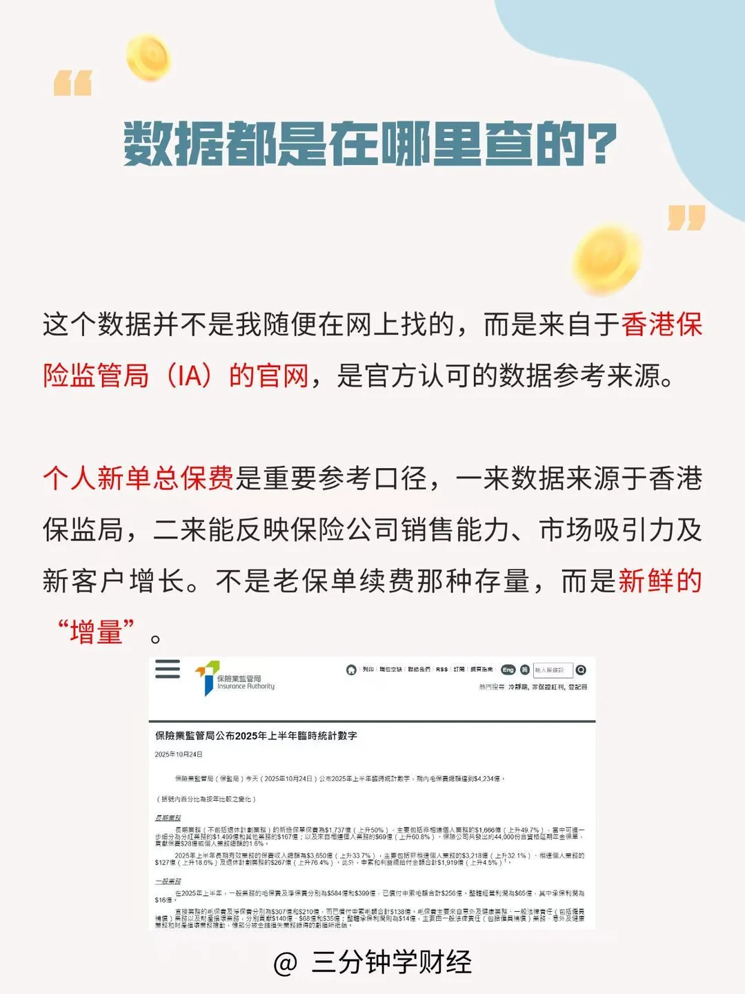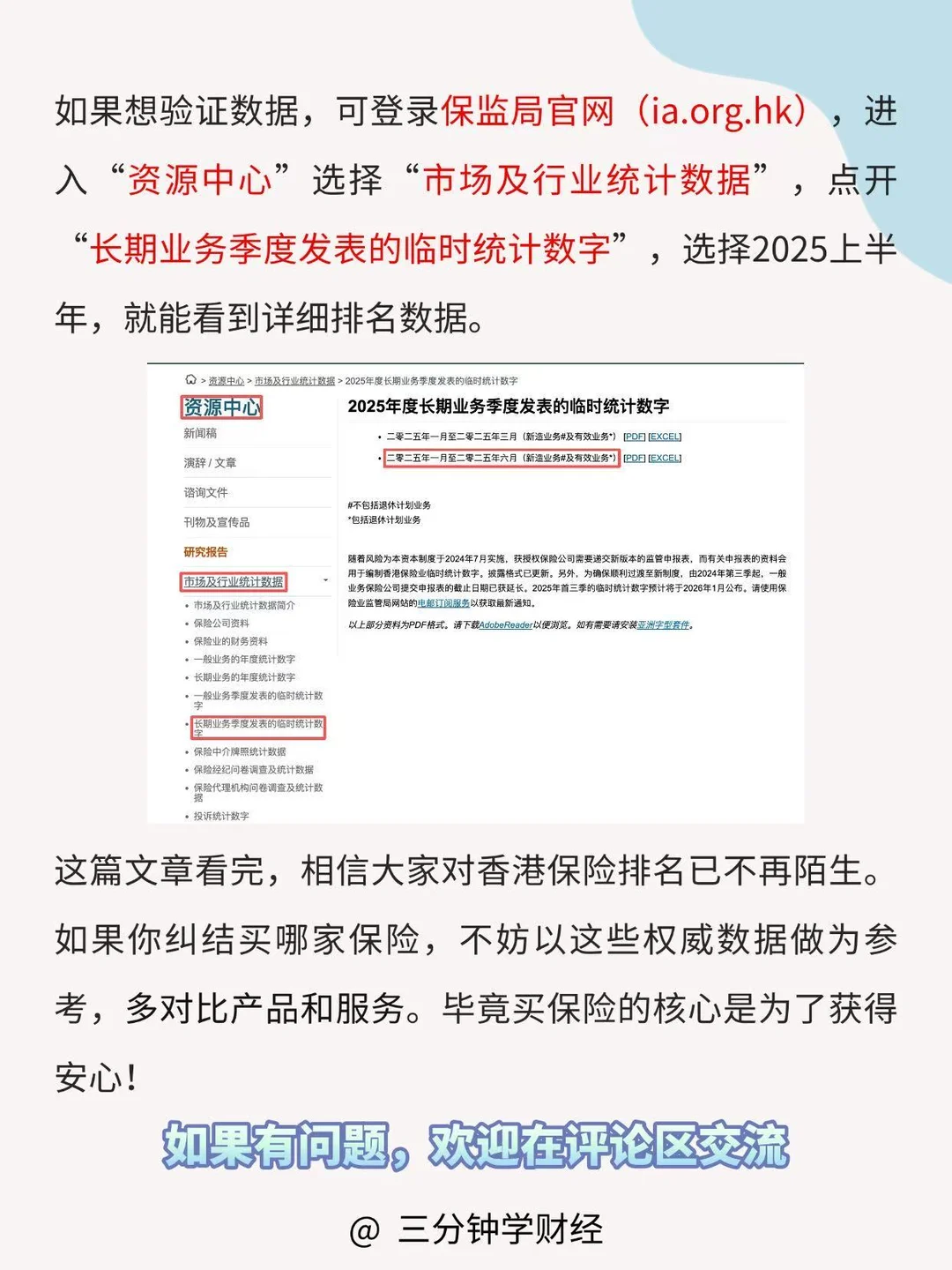 如果想验证数据,可登录保监局官网(ia.org.hk),进入“资源中心”选择“市场及行业统计数据”,点开“长期业务季度发表的临时统计数字”,选择2025上半年,就能看到详细排名数据。