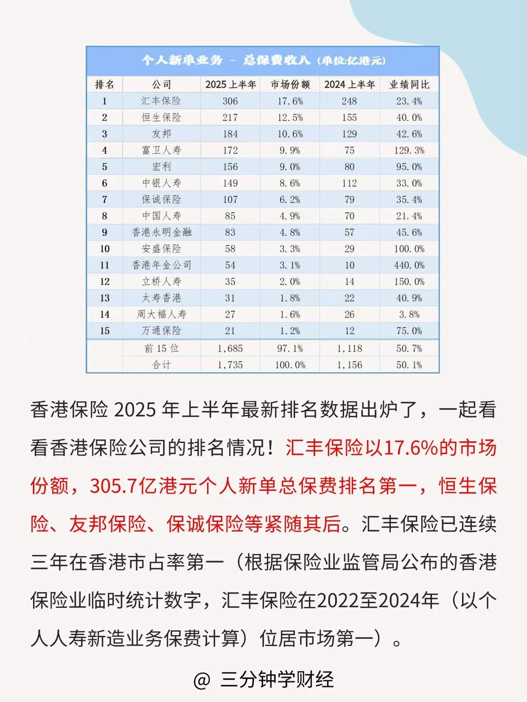 香港保险 2025 年上半年最新排名数据出炉了,一起看看香港保险公司的排名情况!要知道,买保险的时候,这排名可是重要参考,能帮咱们了解各家保险公司的实力,数据来自香港保险业监管局,权威性与透明度不用质疑。