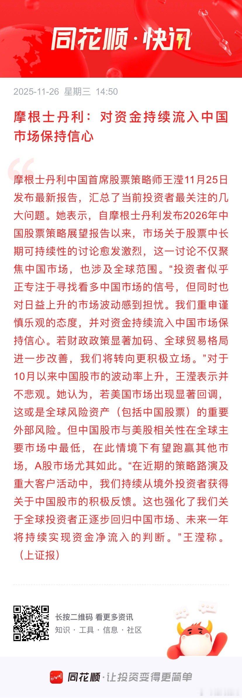 摩根士丹利:对资金持续流入中国市场保持信心 摩根士丹利中国首席股票策略师王滢11月25日发布最新报告,汇总了当前投资者最关注的几大问题。她表示,自摩根士丹利发布2026年中国股票策略展望报告以来,市场关于股票中长期可持续性的讨论愈发激烈,这一讨论不仅聚焦中国市场,也涉及全球范围。“投资者似乎正专注于寻找看多中国市场的信号,但同时也对日益上升的市场波动感到担忧。我们重申谨慎乐观的态度,并对资金持续流入中国市场保持信心。若财政政策显著加码、全球贸易格局进一步改善,我们将转向更积极立场。”对于10月以来中国股市的波动率上升,王滢表示并不悲观。她认为,若美国市场出现显著回调,这或是全球风险资产(包括中国股票)的重要外部风险。但中国股市与美股相关性在全球主要市场中最低,在此情境下有望跑赢其他市场,A股市场尤其如此。“在近期的策略路演及重大客户活动中,我们持续从境外投资者获得关于中国股市的积极反馈。这也强化了我们关于全球投资者正逐步回归中国市场、未来一年将持续实现资金净流入的判断。”王滢称。(上证报) 网页链接