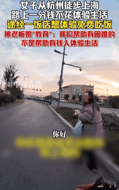 “有钱人的乐子!”女子以“一分钱不花体验生活”为目标,从杭州徒步到上海。途经一饭店想免费吃饭,老板娘教育:“我们不帮助有钱人体验生活!” (来源:中安在线) 近日,一女子在网上发了一段徒步的视频引发网友们的讨论。 视频中,女子从杭州出发徒步前往上海,徒步期间不能花一分钱,以此来体验生活。 路上,女子先是求助了一位女路人:“小美女你好,我是从杭州徒步到上海的,这一路上所有吃跟住的问题都得自己解决!所以我能请您帮我一个忙吗……” 话音刚落,女路人便拒绝了:“不能!” 女路人打量过女子的装扮,徒步装备齐全,虽是运动装但也光鲜亮丽,还贴着精致的美甲。一看便知道是个有钱人! 遭到拒绝后女子没有过多纠缠和解释,而是继续前行。 随后,女子途经一饭店,饭香味馋得她走不动道。她走进店里好声好气地询问老板娘能不能让她免费吃一顿饭,并说明了原因。 闻言,围着花围裙的老板娘语气直白地回答:“你们这些有钱人还来体验生活,一顿饭钱都舍不得给!” 女子耐心解释:“不是不舍得,是不让花,这是一堂体验课。” 这位老板娘是个直肠子:“我们是帮助那些有困难的、要饭的,不是你们这些有钱人,你们有钱人是体验生活的!” 女子被老板娘怼的哑口无言,只好一边道谢一边灰溜溜地离开。 老板娘和女子的对话就像一面镜子,照出了一种令人无法理解的“生活实验”。有的人吃不上饭,为了生计奔波劳碌。有的人把别人的悲剧生活当成一种“生活体验”。 老板娘的话虽说的直白,却是实打实的硬道理。善意也是有标尺的,是给真正有需要的人托底,而不是给衣食无忧的人当成体验活动的。 如果所有人都这样体验生活,蹭吃蹭喝,那饭馆还能开下去吗?那些真正需要帮助的人也许会因为你的一次“体验”而失去救命稻草。 别拿“体验生活”的幌子来占便宜,你口中所谓的体验是别人实打实的生计。别消费他人的善意,别把苦难当成乐趣!