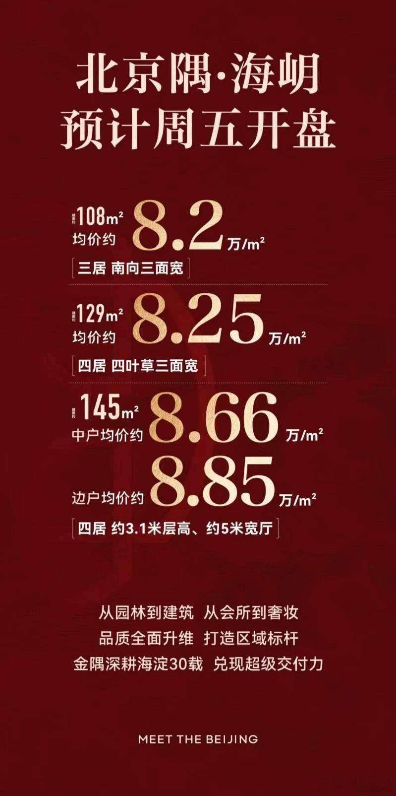 海淀宝山项目都要赶这周五28号开盘海宸元境99㎡,808万上车海淀,单价8.16139㎡楼王端户,封顶1216万,最高单价8.75107㎡三面宽、优质楼栋,单价约约8.2-8.3万左右目前海宸元境针对排卡客户已经可以选定意向房源,取证开盘后可以直接认购签约。北京隅海岄108平三居,均价8.2129平四居,均价8.25145平四居,中间户均价8.66,边户8.85海宸元境99/107,海岄108户型都是8万出头,总价单价都比较低,单边上车海淀,应该买的都不会太差,107/108的价格面积接近,还是有竞争。海宸元境181平,稀缺改善面积段,套数少,改善一步到位,也好卖海宸元境123海岄129,海宸元境139海岄145,套数多,才是主要竞争对手。北京楼市北京海淀