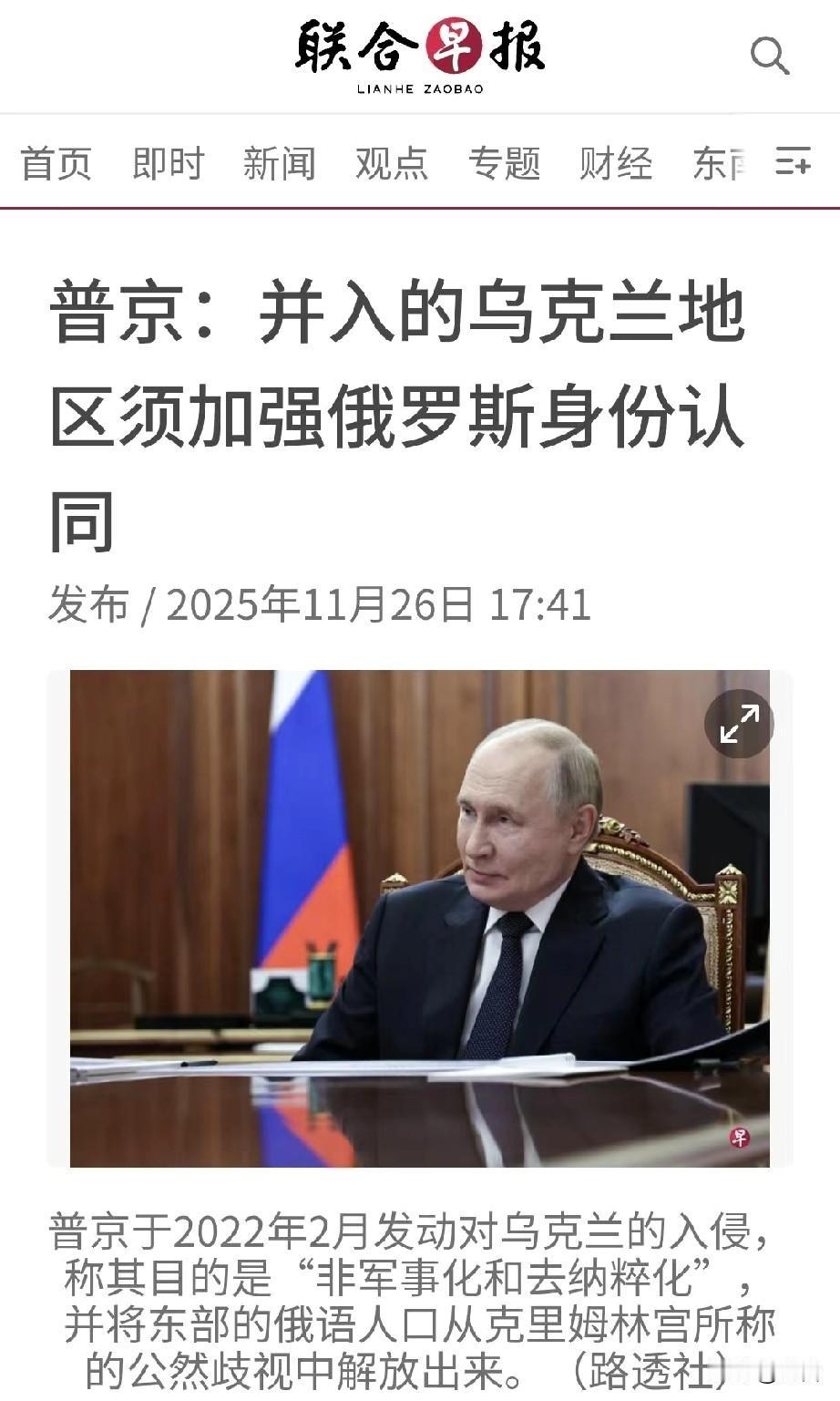 普京签署文件:确保2036年顿涅茨克、卢甘斯克、赫尔松和扎波罗热等地区俄罗斯居民身份认同感达到95%。并将该地区称为“恢复俄罗斯历史领土统一” 路透社报道:11月25日,普京签署了《2036年前俄罗斯联邦国家民族政策战略》,明确提出到2036年,俄罗斯95%以上人口需首先认同自己是“俄罗斯人”,尤其是在2022年并入的“新俄罗斯地区”。 文件强调:俄语推广作为凝聚力的核心工具,保护并推广俄罗斯文化传统;到2036年,不少于90%的俄罗斯公民都能流畅的使用俄语。 截至2025年,新地区约12.5万平方公里的土地。这些地区2021年人口普查显示,自我认同为俄罗斯族的比例约为71.7%,较2010年的77.7%明显下降。