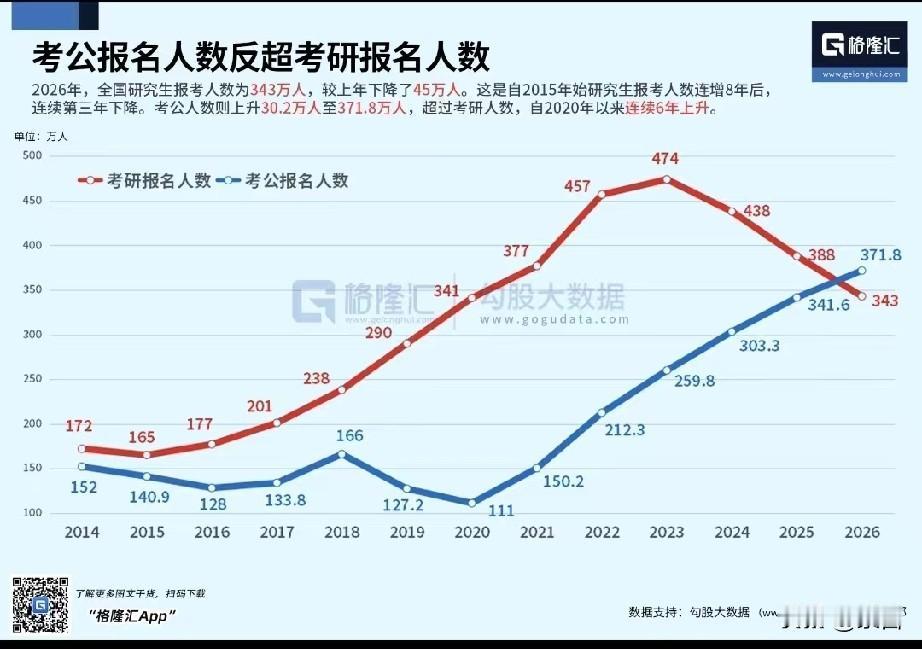 三年巨变!考研人数下降131万,考公人数增加112万,2026年中国考公人数15年来首次超过考研人数。 教育部数据显示:2026年全国考研报名人数为343万,较2023年的峰值下降131万,实现“三连降”。与此同时,2026年国考报名人数升至371.8万,反超考研人数 反超,不仅仅是中国青年职业选择风向的转变,更体现了时代的变迁。 考研热“退潮”,读研成本大增。研究生学历不在稀缺,考研成了“性价比”不高的选择 而公务员的“稳定”在当下极具吸引力,高达51%的毕业生认为“稳定最重要”。有学生表示与其读三年研究生,不如花三年时间考公上岸。 这场百万级的人口流向转变,意味着什么!未来又会给我们带来什么