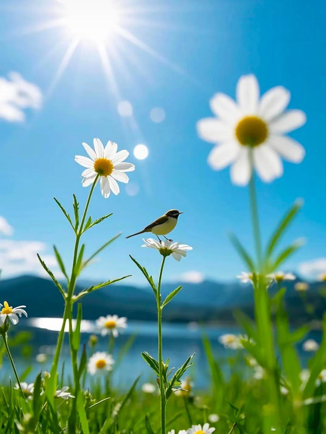 雏菊踮着脚举着奶白花瓣,蕊心是揉碎的金箔,在蓝得发脆的天空下晃成一片软绵的浪。有只小山雀偏要做浪尖的星子,收拢褐色羽翅,踮在花盘上歪头望——风掠过它绒绒的颈,连带着花茎也轻轻晃,像把春天的余温晃成了细碎的光斑。远处湖镜浸着云影,山线在雾里洇成淡青,所有色彩都轻得像呼吸。这一瞬,时间也慢成了雏菊的茎脉,每缕风都裹着草木香,连心跳都沾了点蓬松的甜。
