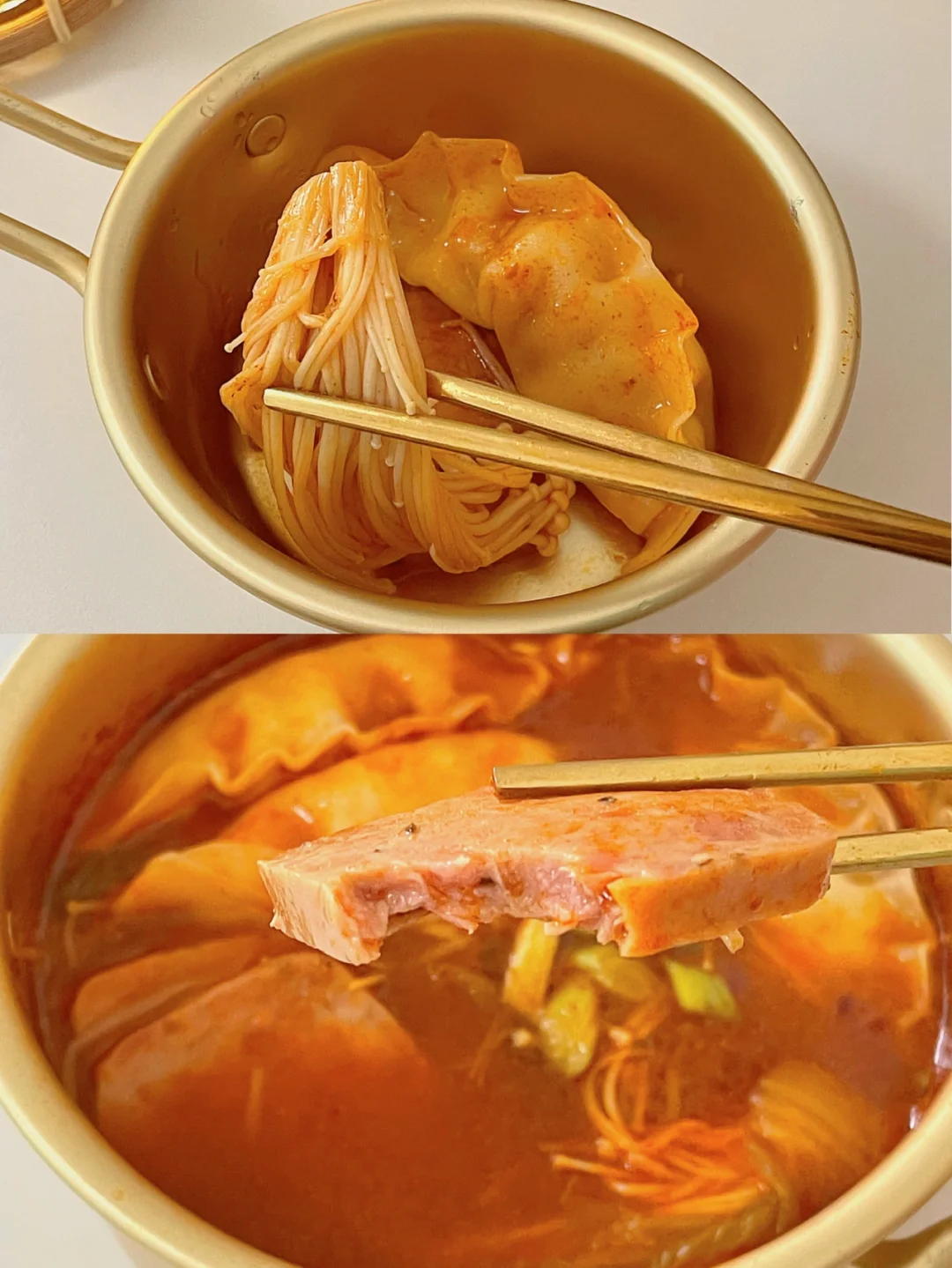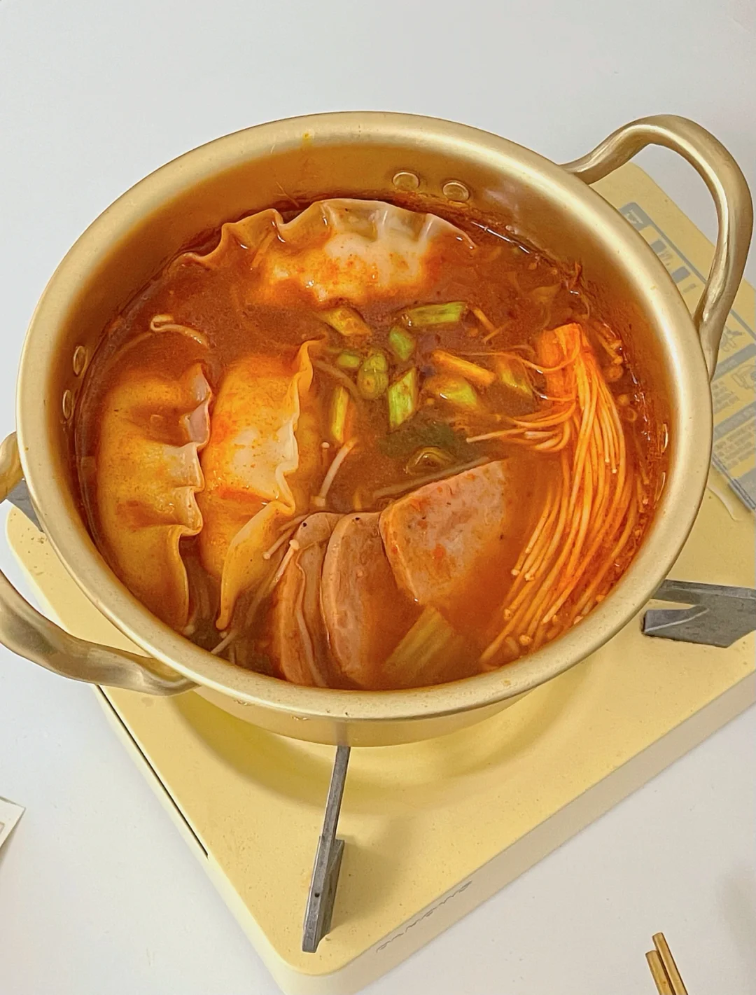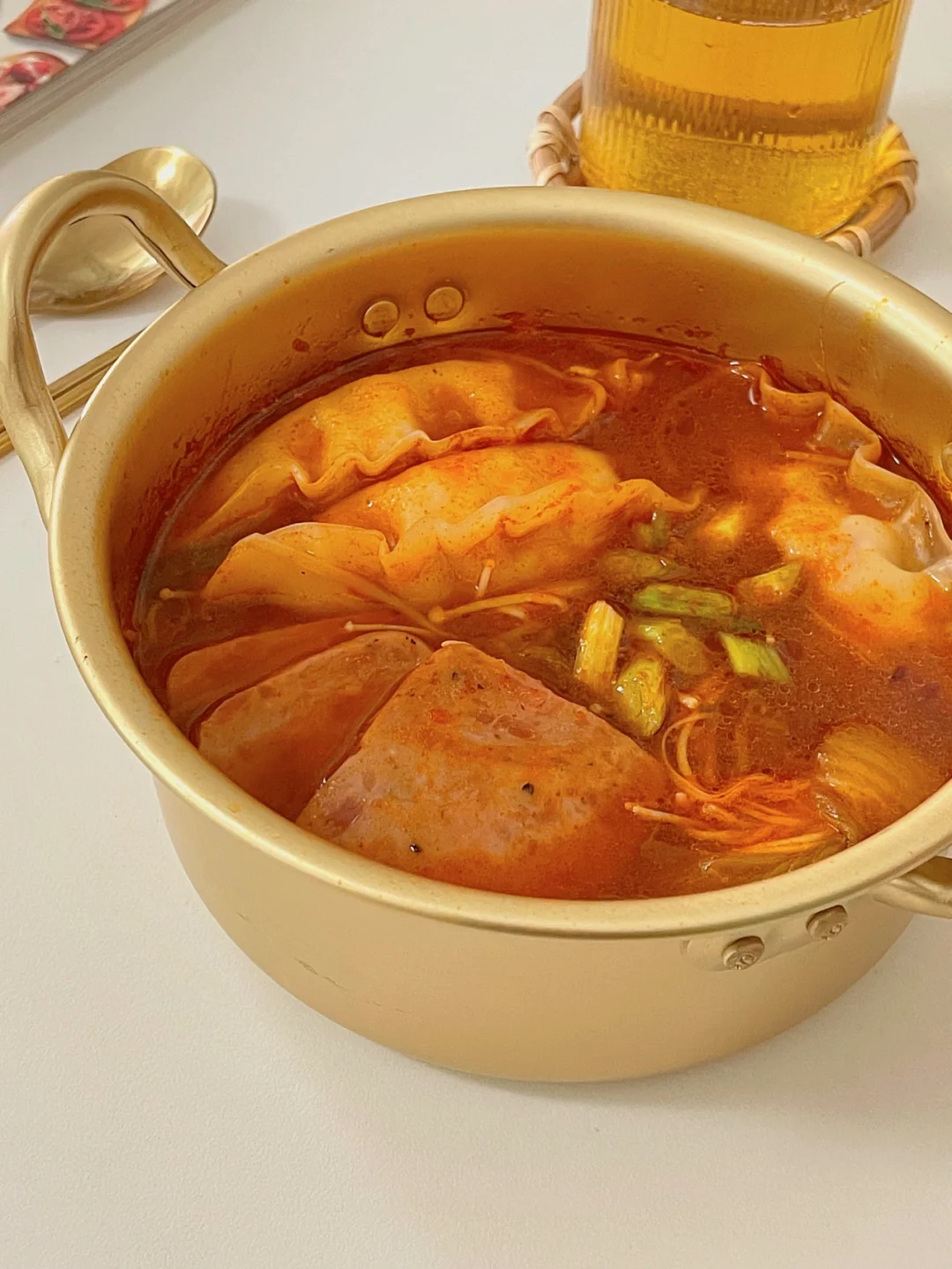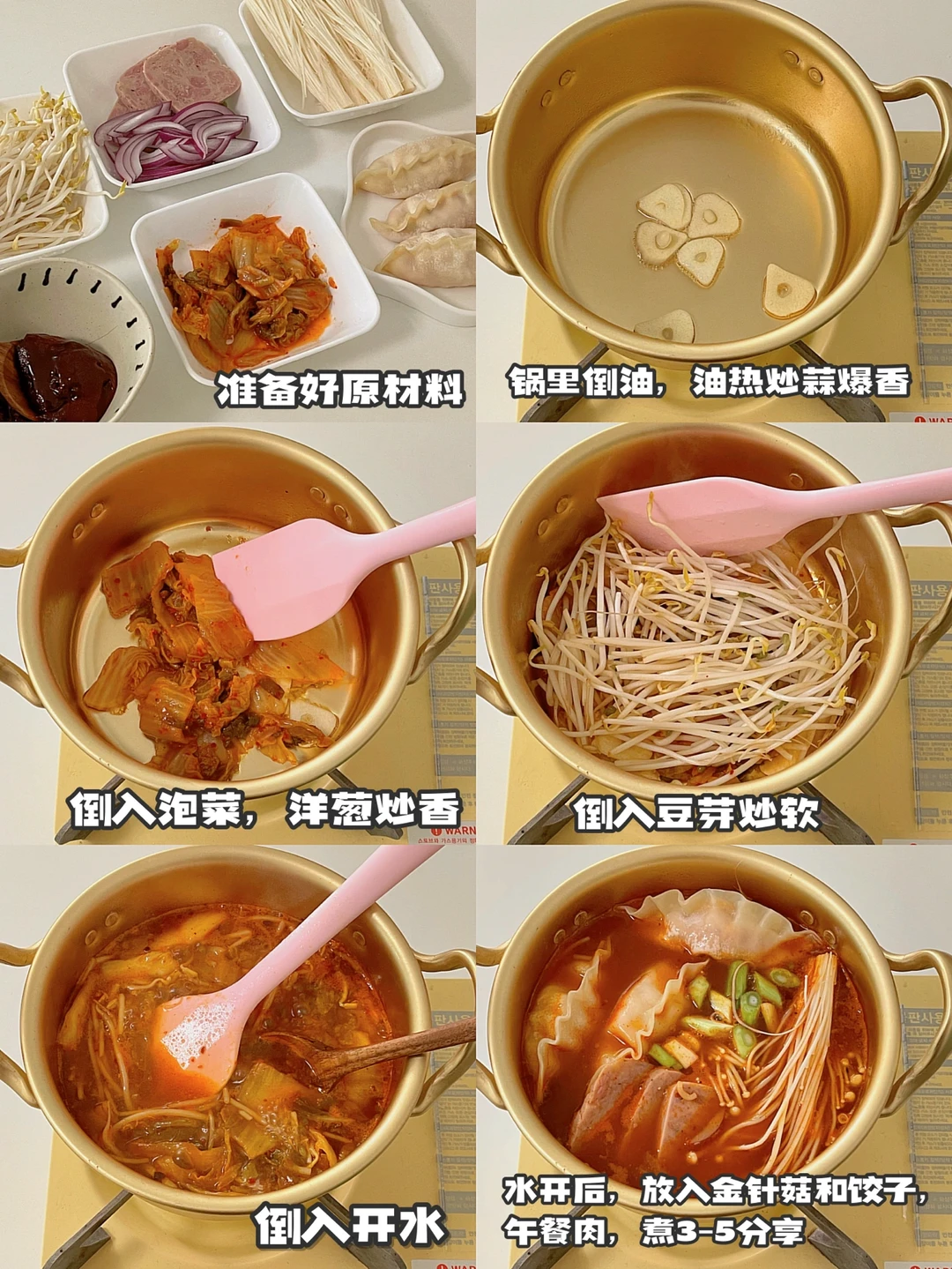 降温的天气,来一份热乎的泡菜饺子锅🍲 加了蔬菜和肉第一口汤底就感受到幸福啦 一小锅咕噜咕噜的声音 冬日治愈❄️ 食材⬇️ 泡菜|豆芽|金针菇|洋葱|泡菜饺子|韩式辣酱|辣椒面|酱油|大蒜|午餐肉 做法请看图三📝 1锅里热油,把大蒜放进去爆香 2,倒入泡菜和洋葱炒软后,倒入豆芽炒软3,加入开水+1勺辣椒面+1勺酱油调味 4水开后放入金针菇,饺子,午餐肉煮3-5分钟5,放入葱段点缀,就可以开吃啦多 -大家也可以放入自己喜欢吃的配菜 简单快手的一餐完成[派对R] 这个汤真的超级好喝,推荐💯