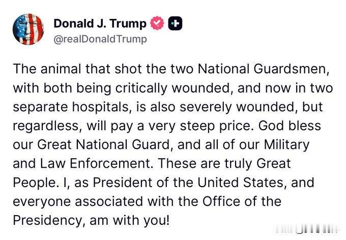 美国首都华盛顿发生一起枪击案。枪手伏击了在白宫附近的两名国民警卫队士兵,导致士兵身负重伤,生命垂危。随后赶来的警察和特勤局特工将枪手包围,双方发生对峙。 嫌疑人被打伤并已被逮捕,从警方传出的图片显示,枪手赤裸上身,全身缠满绷带,被绑在担架上,在医护人员和警察的簇拥下被紧急送上救护车。 美国总统特朗普在社交平台上发文,称枪手是“畜生”,并将“付出沉重代价”。 现在有报道称,枪手是29岁的阿富汗非法移民拉赫曼努拉·拉坎瓦尔,他在开火的时候高呼“真主至大”(ALLAHU AKBAR)。 与极端主义者相比,美国面临的贸易、通胀等问题都是毛毛雨。极端主义意识形态才会真正要美国的命。