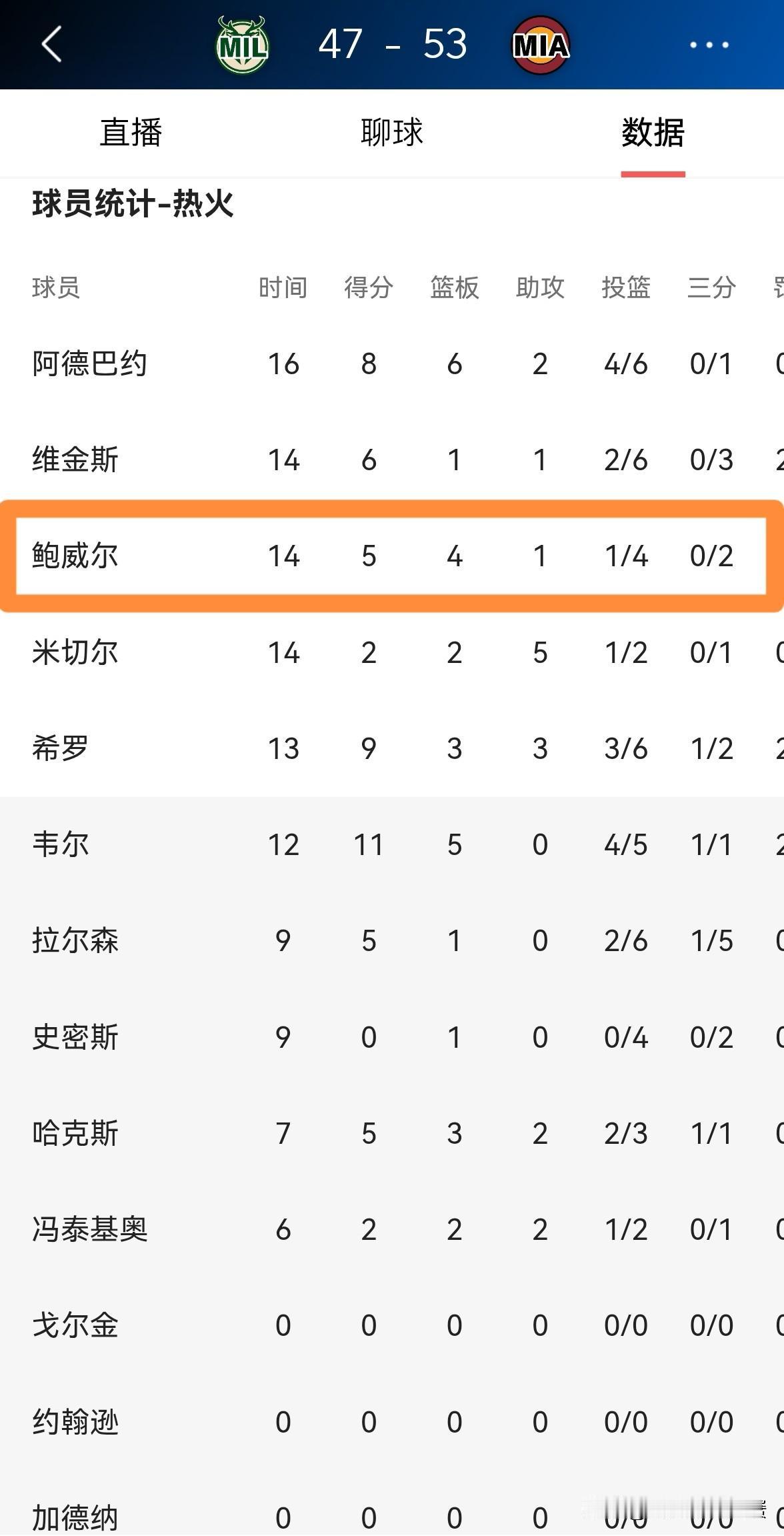 热火超级得分手鲍威尔真是特别的拉胯!在今天进行的热火和雄鹿的比赛中,目前双方半场战罢,热火以53:47领先对手。在前两节比赛中,鲍威尔首发出战14分钟,投篮4中1,其中三分球2中0、罚球3中3仅仅得到5分,还出现了2次失误。 作为热火的绝对核心,鲍威尔在上半场比赛中的表现真是惨不忍睹,他真的配不上“鲍科比”的美誉。
