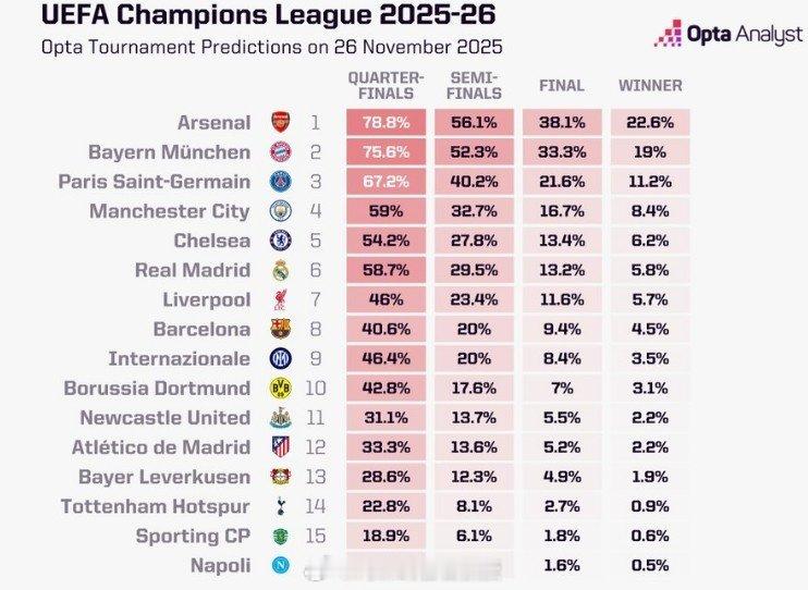 阿森纳自2005-06赛季以来首次在欧冠联赛中取得开局五连胜,OPTA更新欧冠夺冠概率:1、阿森纳 22.6%2、拜仁 19%3、巴黎 11.2%4、曼城 8.4%5、切尔西 6.2% 阿森纳3比1拜仁 阿森纳欧冠五连胜 全网热点共创计划