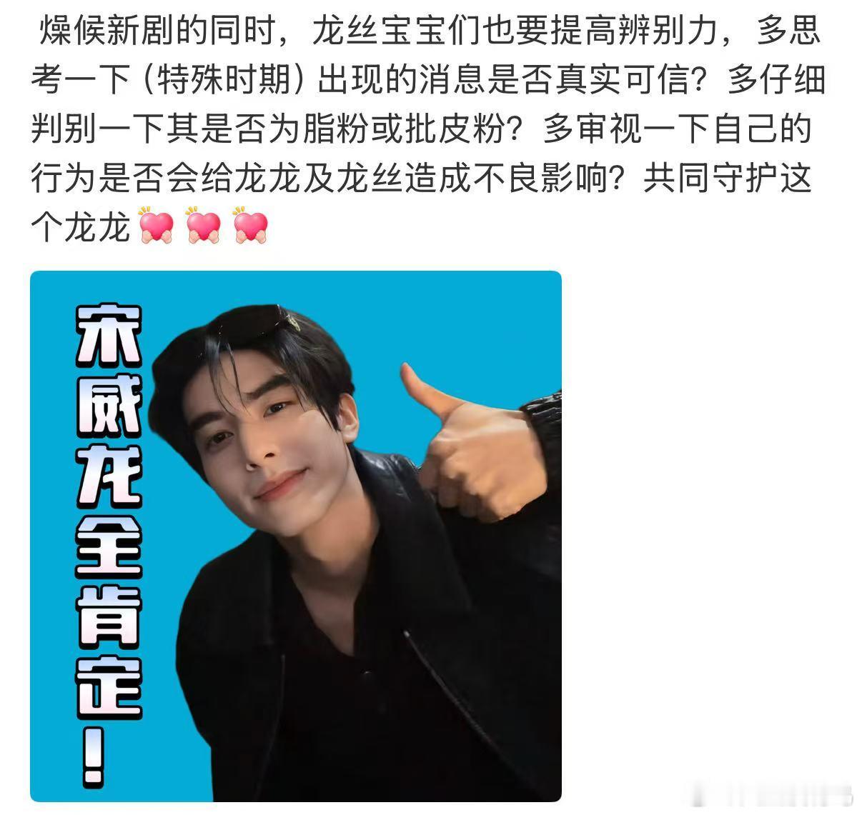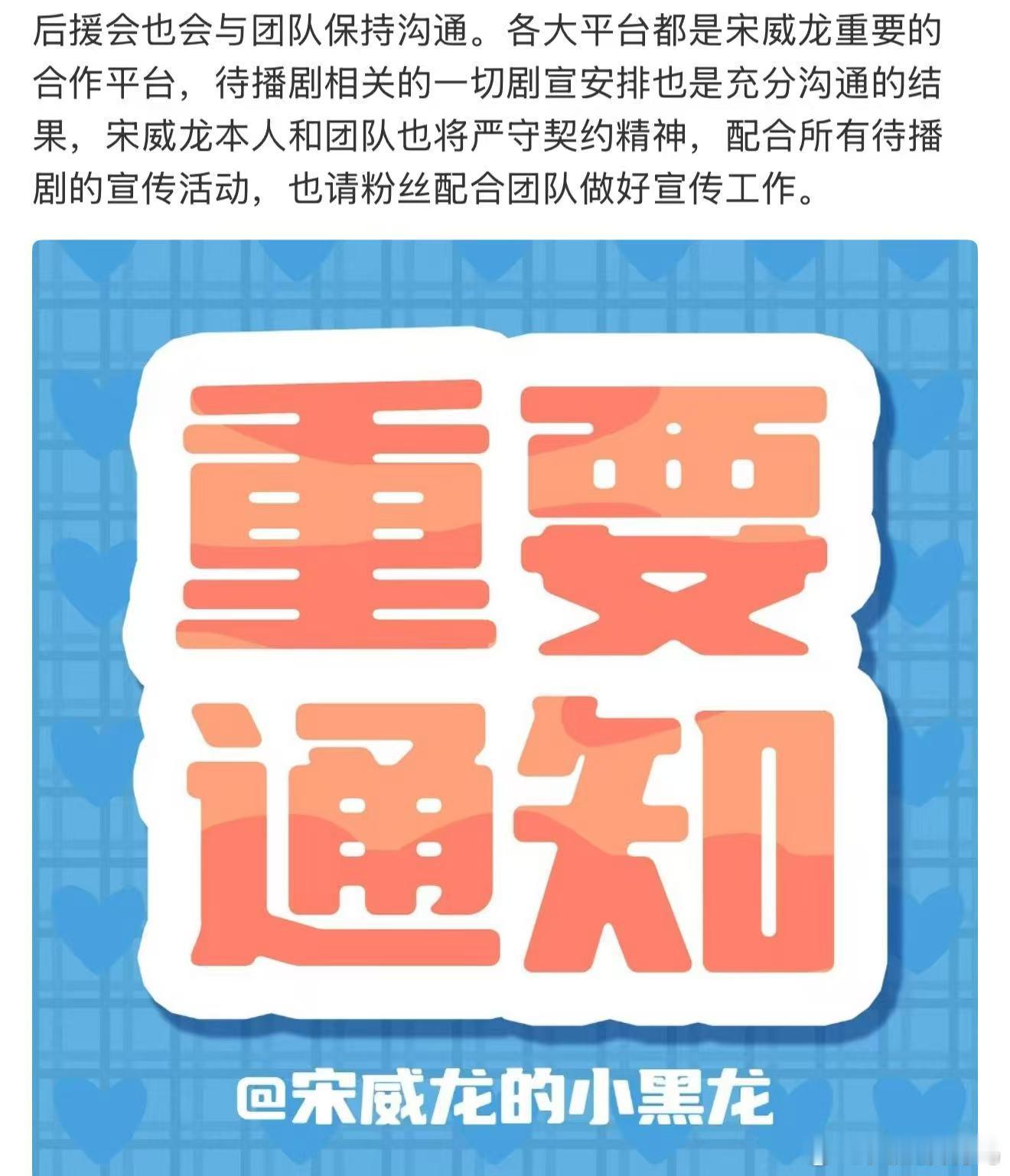 宋威龙粉丝回应了网传出席跨年演唱会的安排,表示无论哪部剧都是宋威龙的作品,会全力配合所有待播剧的宣传动作,这才是真粉丝的态度啊!!