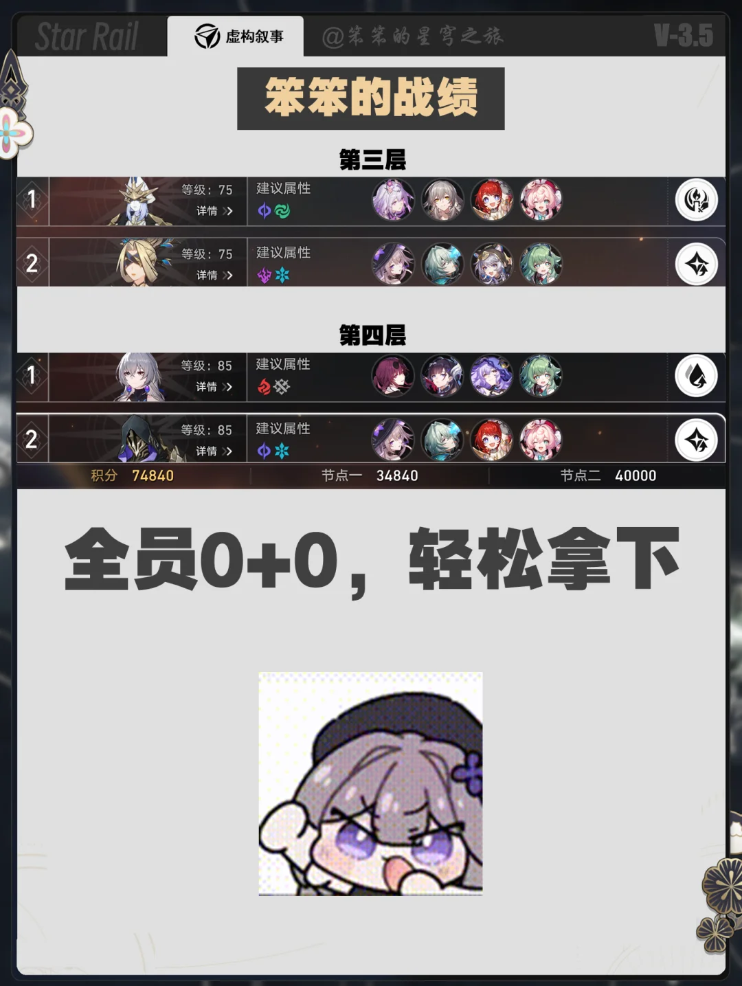🐱大家好,我是笨笨的铲屎官 新的一期虚构叙事上线了 这一期有dot的环境 卡黑、黄泉+dot也是站起来了 其他的包括白厄、大黑塔、遐蝶都可以一战 整体而言还是比较轻松的