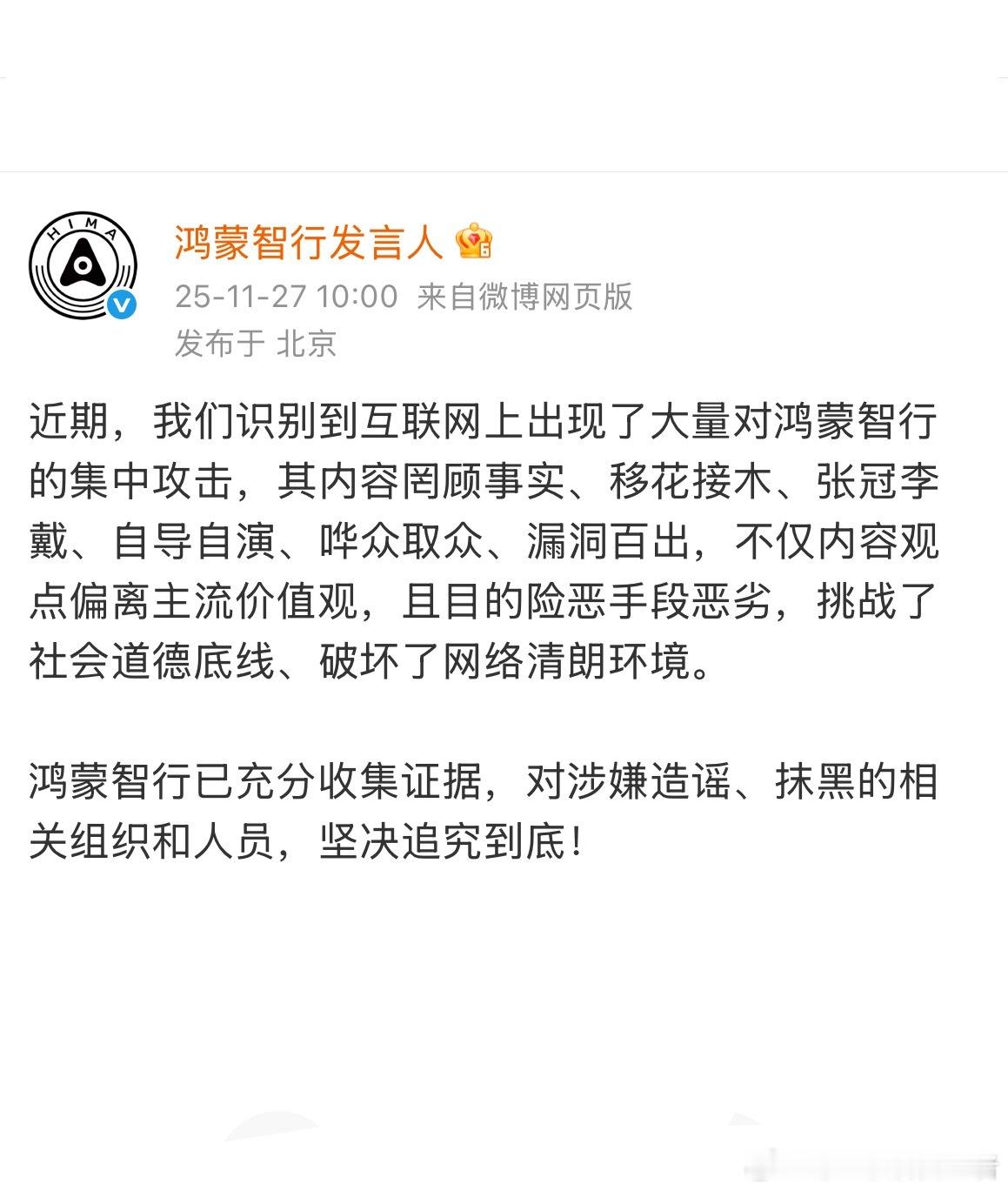 鸿蒙智行近期遭到各式集中攻击,现已充分收集好证据,对涉嫌造谣、摸黑的相关组织和人员,追究到底。