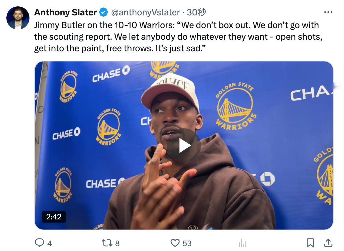 巴特勒谈到目前战绩为 10 胜 10 负的勇士队时说:“我们不去卡位抢篮板(box out)。我们不执行球探报告(的要求)。我们让任何人想做什么就做什么——空位投篮,突入禁区,罚球。这简直是可悲。”