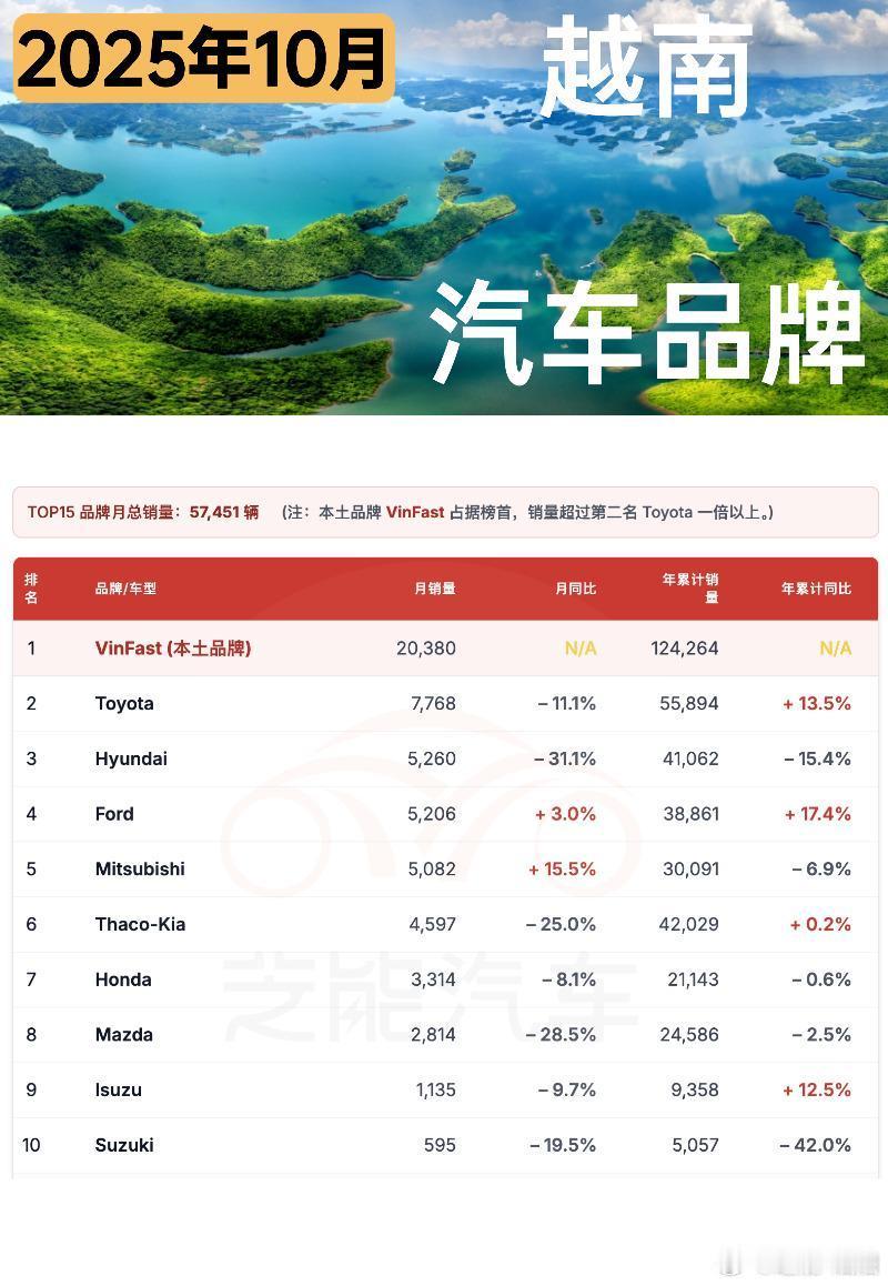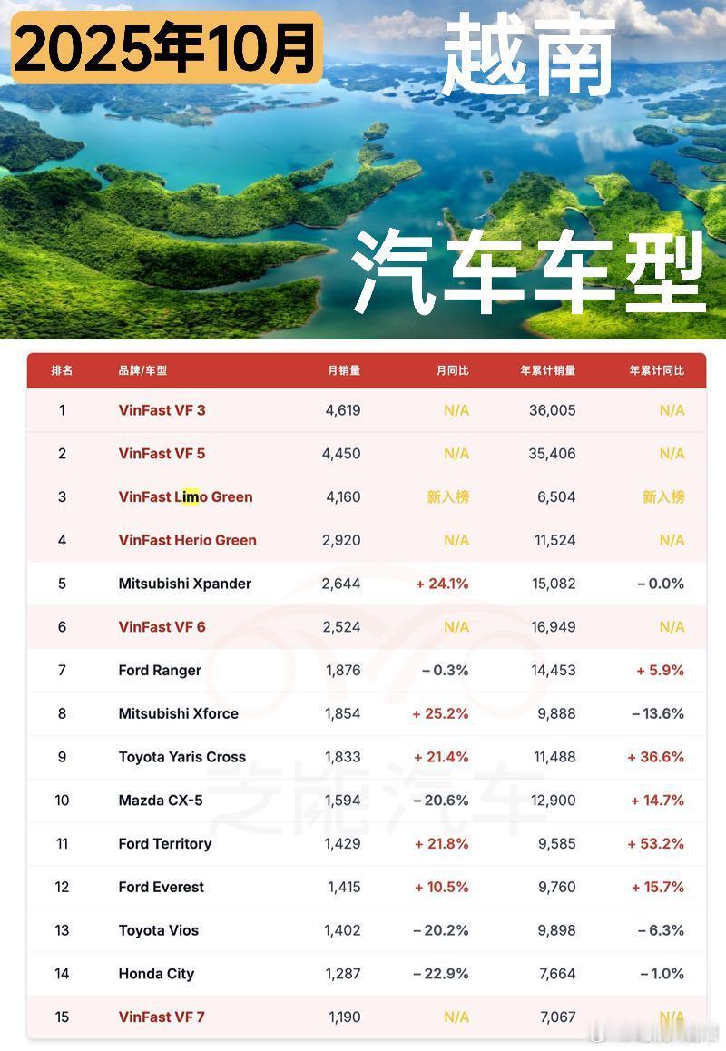 10 月越南车市整体销量同比下滑,但累计仍有增长。本土品牌 VinFast 表现抢眼,销量创历史新高,车型榜包揽前四,多款车型跻身前列。丰田、现代等外资品牌销量下滑,三菱、福特部分车型逆势增长,本土品牌的强势扩张让市场竞争格局生变~