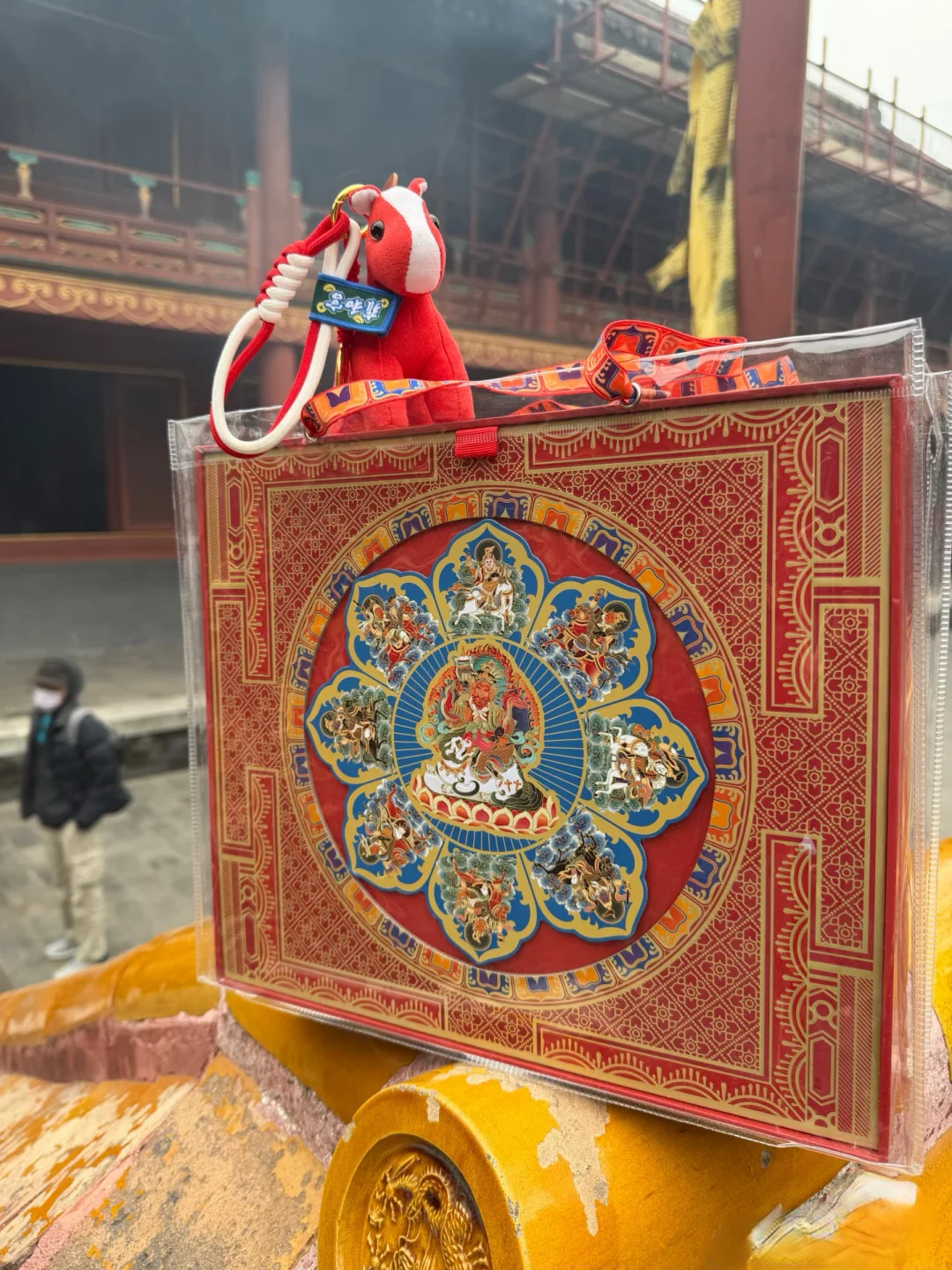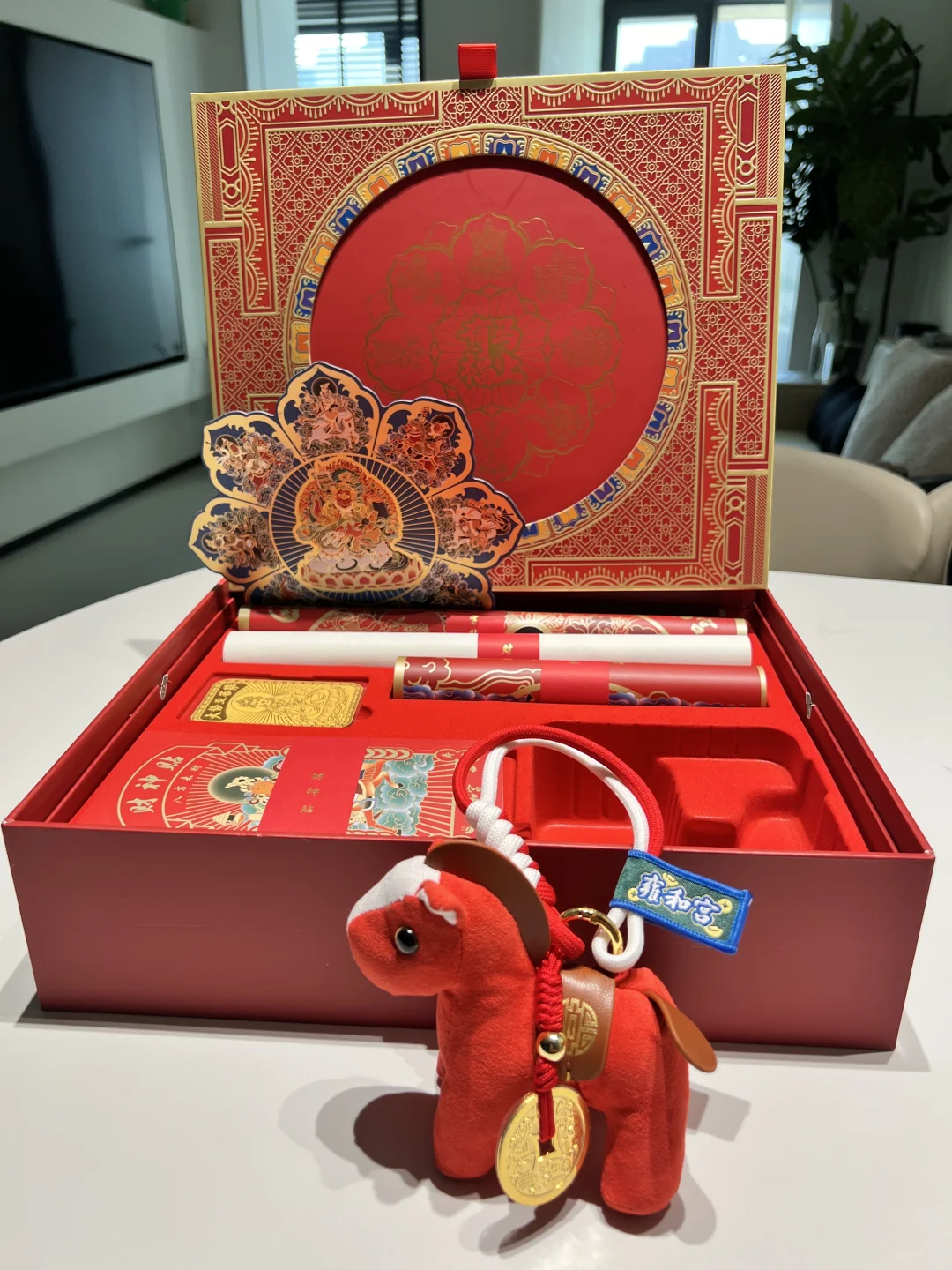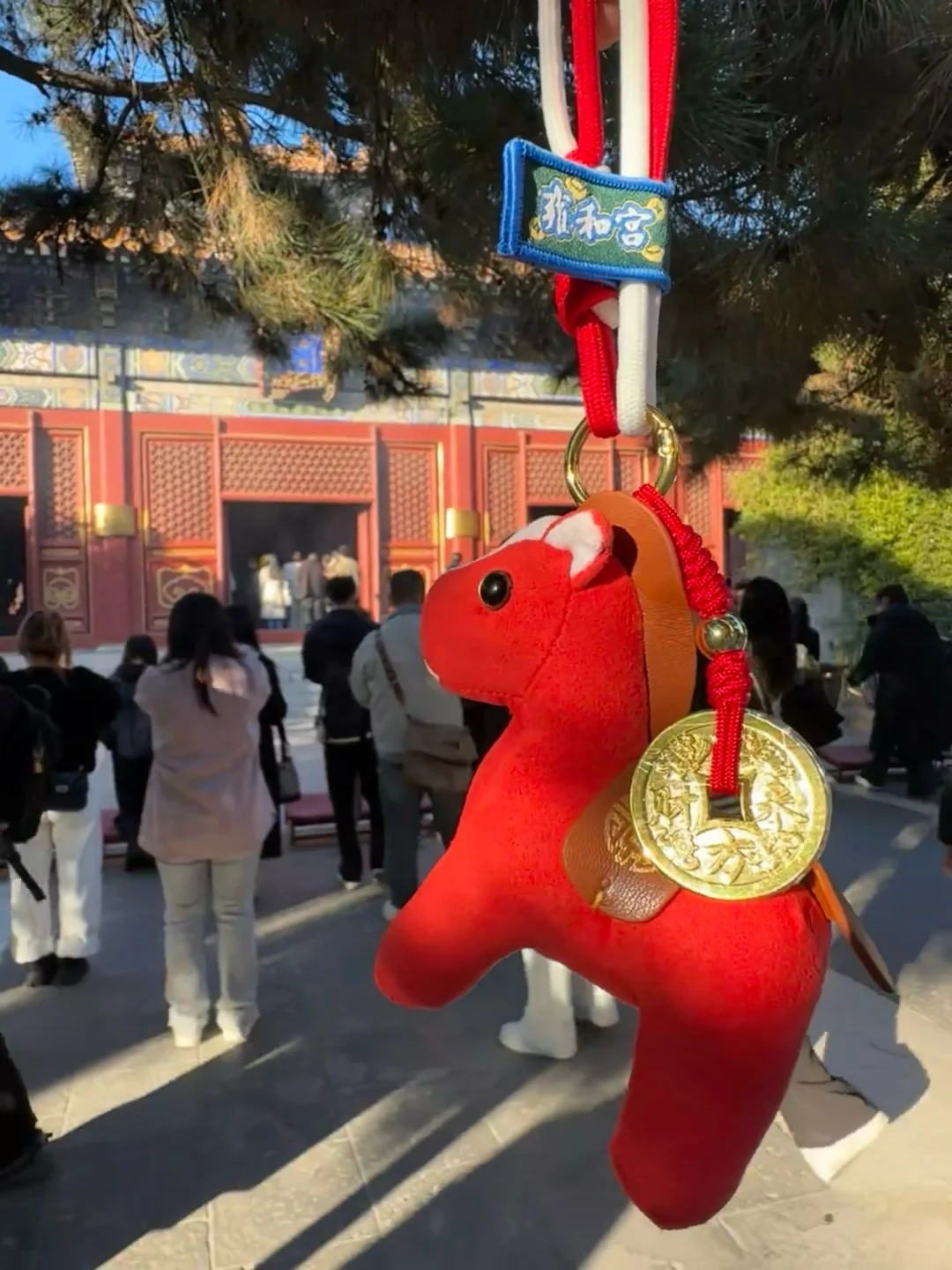 1.红小马挂件:毛绒的,挂绳上有“雍和宫”标,带个铜钱装饰—我挂包上了,摸起来软乎乎。