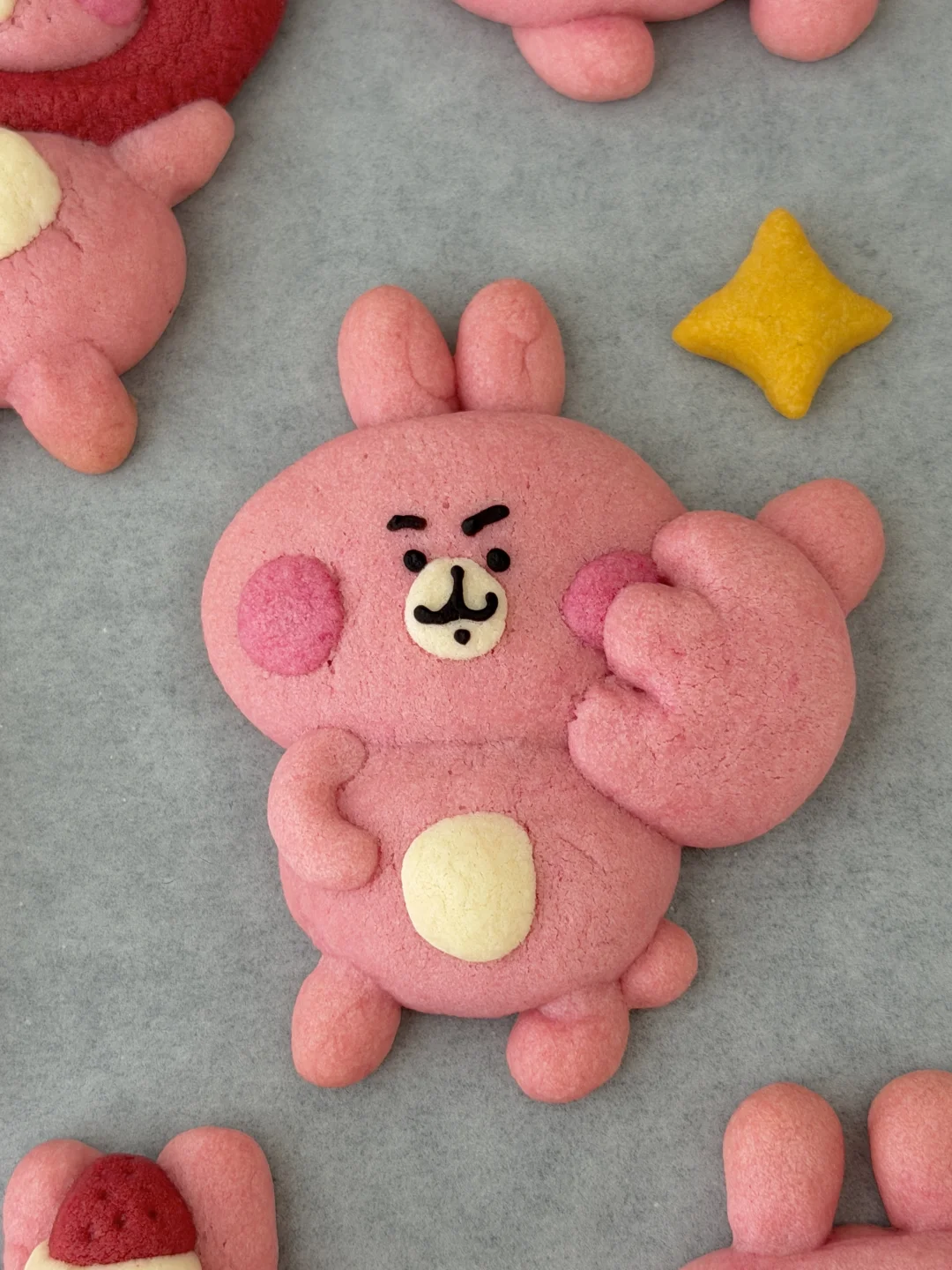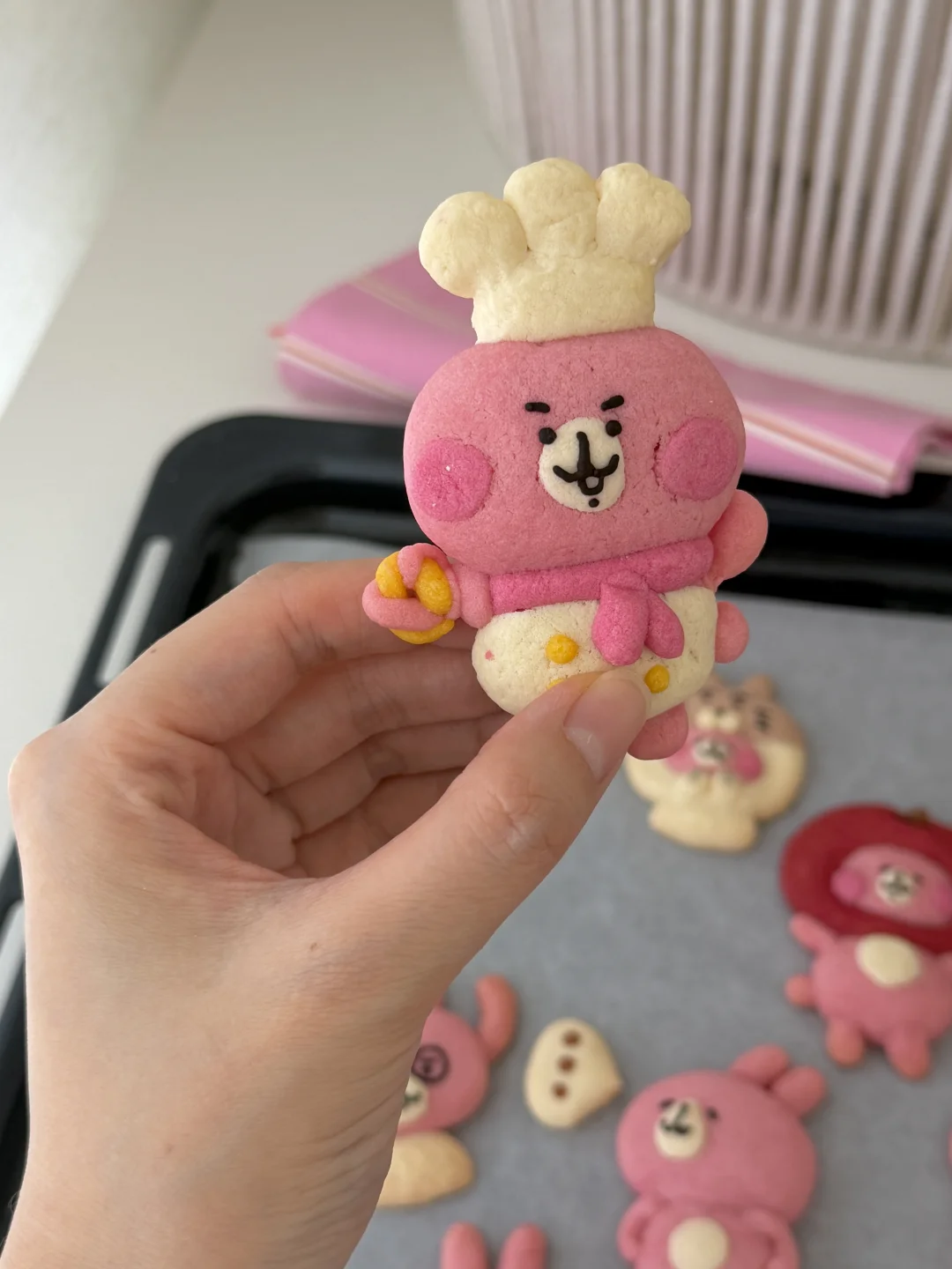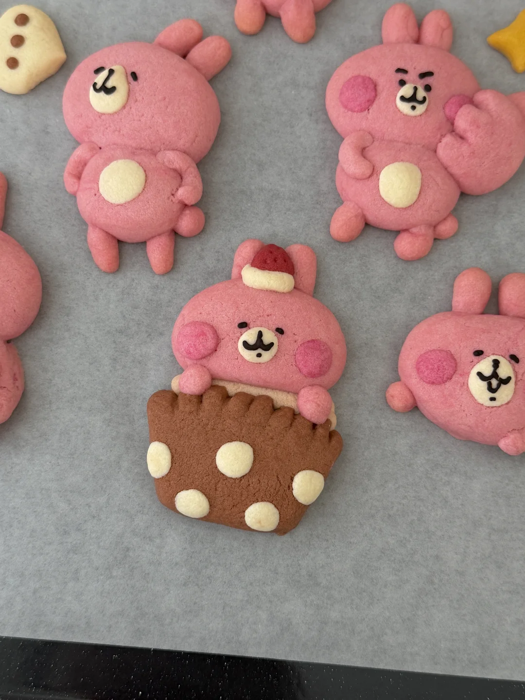 6️⃣烤箱预热,150°烤18分钟左右,烤好后晾凉。用融化的巧克力装在裱花袋里,画出五官细节