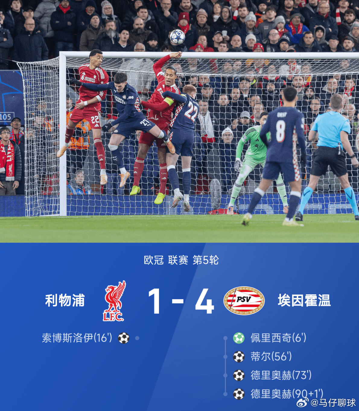 11月27日讯 25/26赛季欧冠联赛第5轮,埃因霍温4-1战胜利物浦。上半场范戴克手球送点,佩里西奇点射命中,索博斯洛伊补射扳平,下半场蒂尔捅射建功,德里奥赫梅开二度。利物浦利物浦VS埃因霍温利物浦 利物浦首发阵容:25-马马尔达什维利、4-范戴克、5-科纳特(76’14-基耶萨)、17-琼斯、6-凯尔凯兹、11-萨拉赫、18-加克波、8-索博斯洛伊、10-麦卡利斯特、38-赫拉芬贝赫、22-埃基蒂克(61’9-伊萨克)利物浦替补阵容:28-伍德曼、74-米斯丘尔、26-罗伯逊、2-戈麦斯、3-远藤航、42-尼奥尼、9-伊萨克、14-基耶萨、73-恩古莫哈埃因霍温首发阵容:32-科瓦尔、22-斯豪滕、8-德斯特、2-埃丁、3-加西奥罗夫斯基、5-佩里西奇(70’11-德里奥赫)、27-曼(89’19-巴伊拉塔雷维奇)、23-费尔曼、17-毛罗、20-蒂尔(70’9-佩皮)、34-塞巴里埃因霍温替补阵容:1-奥利、51-斯摩利纳尔、4-奥比斯波、25-西迪利亚、39-纳加洛、6-弗拉明戈、10-瓦尔纳、31-费尔南德斯、21-博阿杜、9-佩皮、11-德里奥赫、19-巴伊拉塔雷维奇