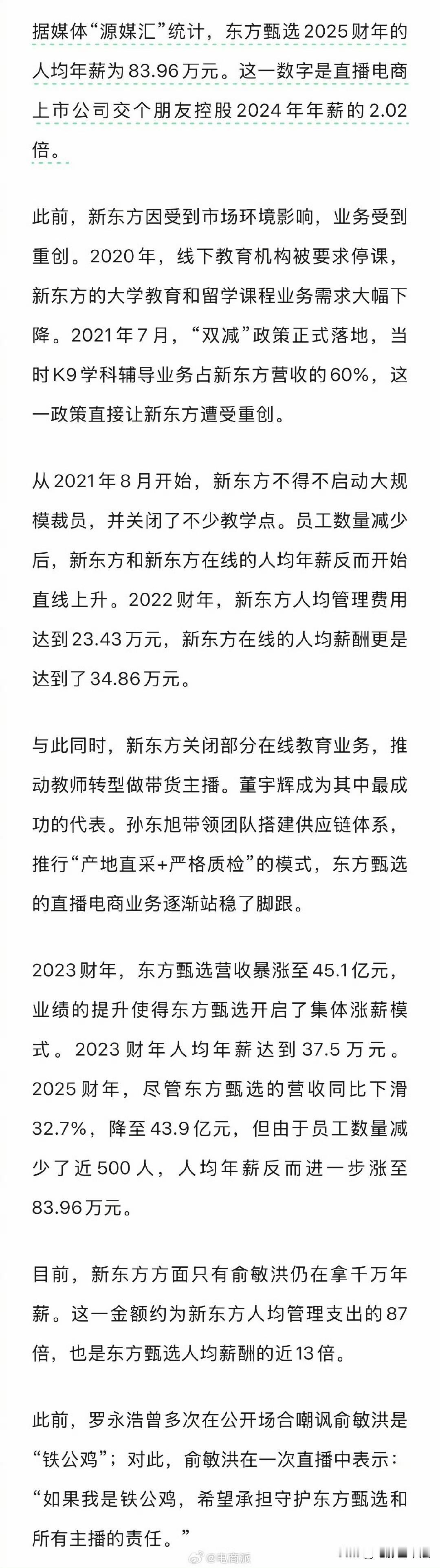 罗永浩被打脸了!东方甄选2025年人均年薪为83.96万,是交个朋友2024年人均年薪的2.02倍。有些人抖机灵,用“我和马云人均亿万富翁”来质疑这个数字,殊不知,新东方老师的年薪本来就非常高,俞敏洪给员工的工资远远高于行业平均水准,要是这点信息都不掌握还在抖机灵,那就是幼稚了。 很好奇与辉同行和交个朋友的2025人均年薪,罗永浩和董宇辉这么大方,这个数字不会低于83.96万吧。
