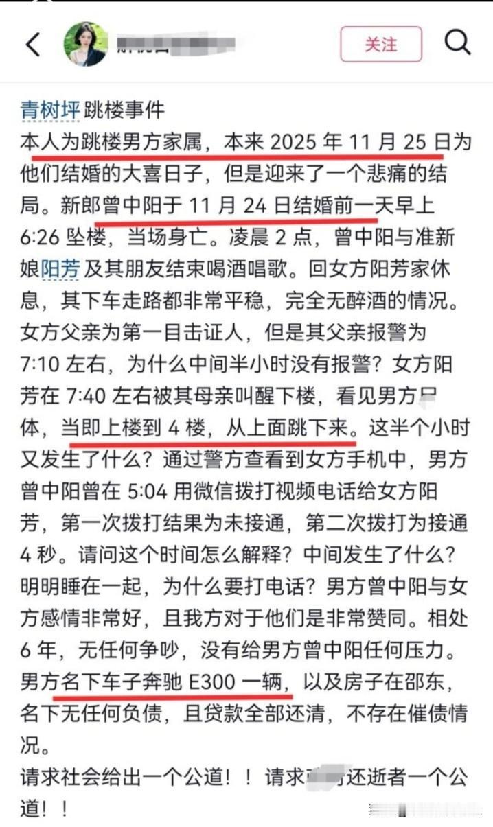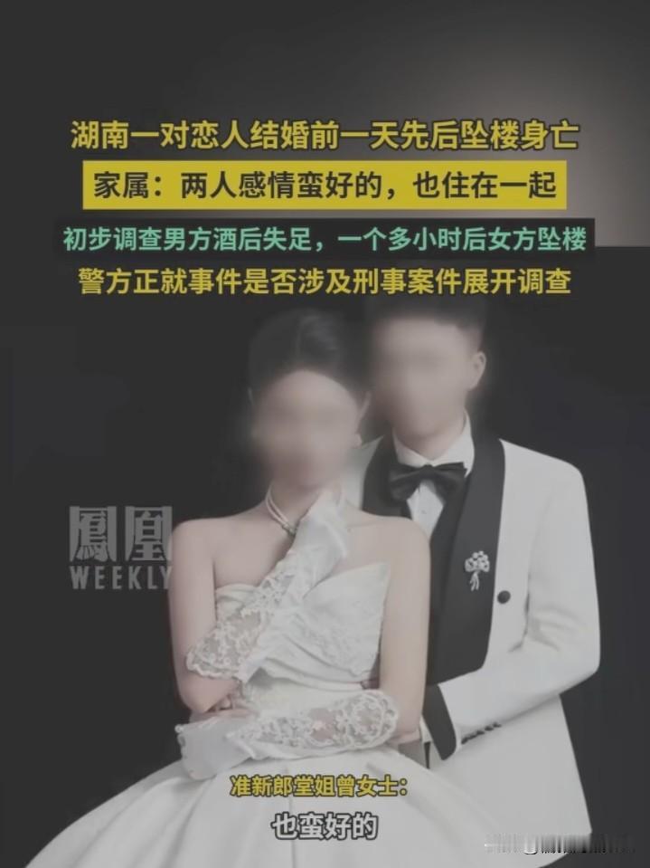 湖南一对恋人结婚前一天先后坠楼身亡,女方父亲情况成焦点,初步调查男方为酒后失足,家属提出质疑。 11月24日,湖南双峰的一对恋人在结婚的前一天,在女方的自建房先后坠楼身亡。警方初步调查为男酒后失足,误将窗户当成了厕所。 男方家属不认可这种说法,提出了几点质疑。从监控中可以看出,一对恋人凌晨两点与其朋友结束喝酒唱歌,回女方家休息,下车走路非常平稳,没有醉态。 曾中阳曾在5点零4分两次给女友打视频电话,第一次未通,第二次接通4秒,明明睡在一起,为什么要打电话? 曾中阳6点26分从四楼坠亡的,女方父亲是第一目击证人,为什么在半小时之后,7点10报警? 按说发生这种事,父亲报警后应该马上告诉女儿及全家,哪还冷静得了,但女友却是7点40分钟被母亲喊醒下楼,看见男方尸体,随即上楼从原地跳了下去。这中间半小时又发生了什么? 男方家属都说两人相处6年,感情非常好,没有发生任何争吵,女友也未给曾中阳任何压力。 曾中阳经济状况也很好,两人共同经营早餐店,名下有一辆奔驰车,也有房,无贷款,无债务。 后续男方堂姐又曝出女方父亲情况,双人不同镇,女方父亲常年赌博,有施暴倾向,不仅打老婆,连自己妹妹也打,在村里的风评非常不好,男方怀疑女方父亲对曾中阳做了什么。 两人感情很好不用质疑,只是太可惜了,相恋五六年终成正果的时刻却以这种方式相随,怎能不令家人心痛?等待官方的结果给双方一个交代。 酒是少喝养身,多喝容易坏事,不能贪杯。任何时候遇到任何事都该冷静理智,人生没有过不去的坎,相爱是多么难得,太遗憾了!