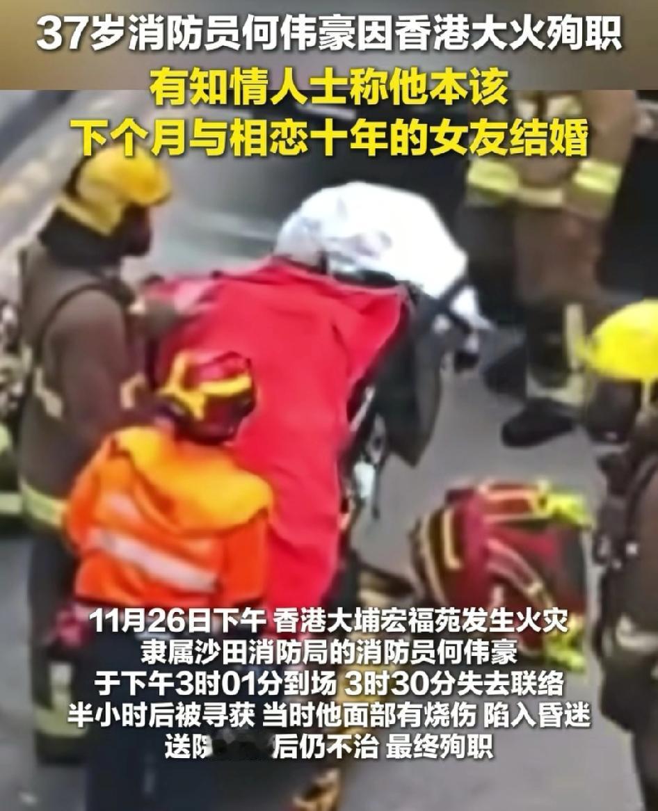 香港大火中牺牲的消防员何伟豪年仅37岁 本来下个月就可以和与自己相恋十年的女友结婚了 可是这场大火太突然了,让一切戛然而止 找到他时,面部已被烧伤,陷入昏迷,送医院抢救无效英勇殉职 让人忍不住落泪 大火无情,向英勇致敬[祈祷][祈祷]