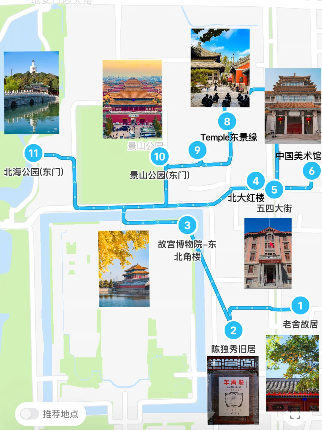 丹柿小院(老舍纪念馆)➡️陈独秀故居➡️故宫角楼➡️五四大街➡️北大红楼➡️中国美术馆➡️temple➡️景山公园(东门)➡️北海公园
